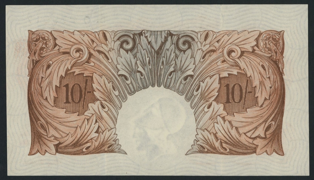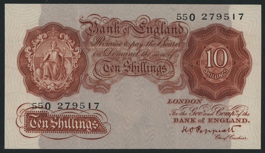 Bank of England, K. O. Peppiatt, 10 Shillings, ND (1948), serial number 55O 279517, a continuation of the pre-war threaded banknotes,