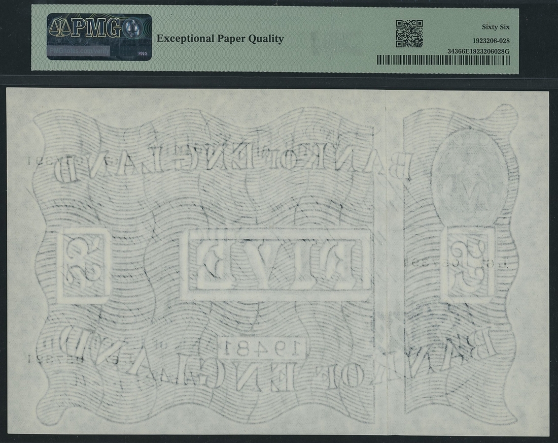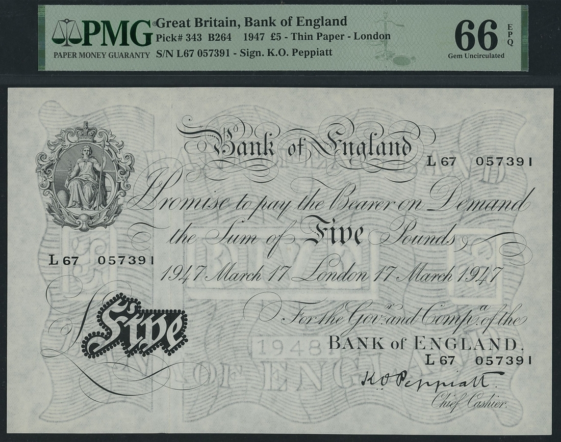 (x) Bank of England, £5, 1947, K. O. Peppiatt, serial number L67 057391, (EPM B264), in PMG holder 66 EPQ Gem Uncirculated