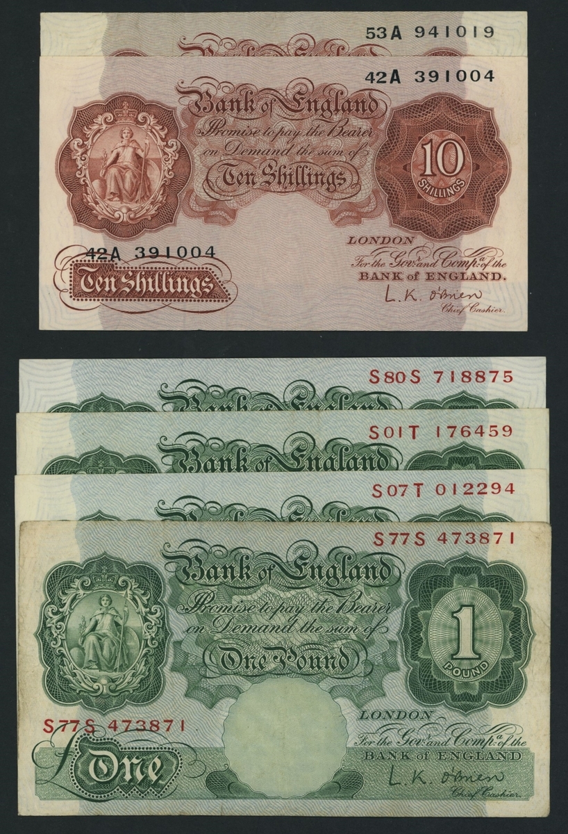 Bank of England, L. K. O'Brien, [6 notes] replacement 10 Shillings, £1, ND (1955), 10 Shillings (2), serial numbers 42A 391004 and 53A 941019,