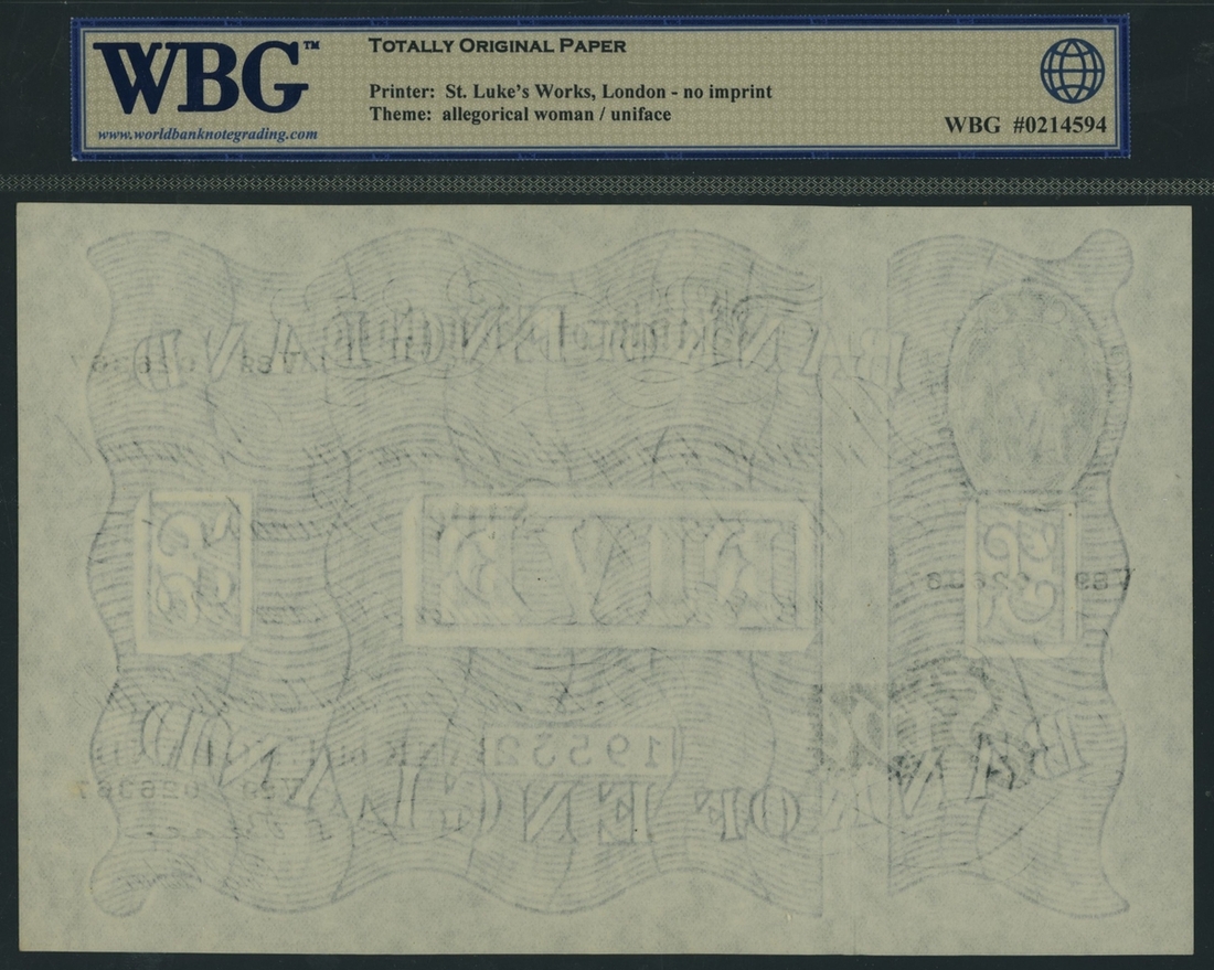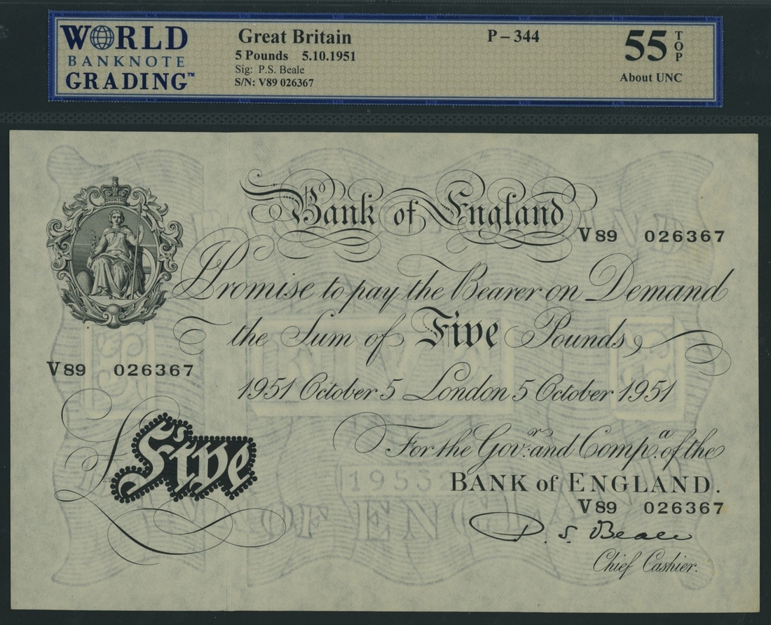(x) Bank of England, £5, London, 5th October 1951, serial number V89 026367, (EPM B270, Pick 344), in WBG holder 55 TOP About Uncirculated