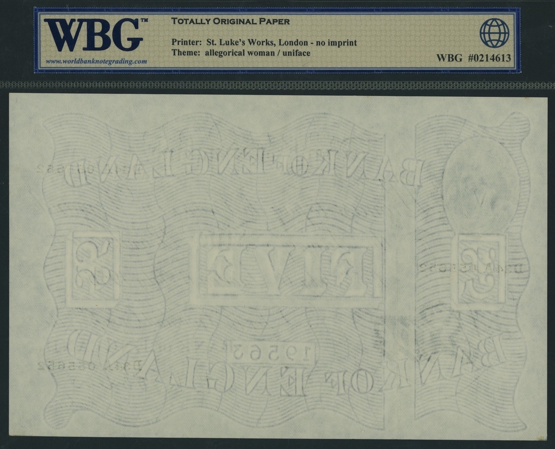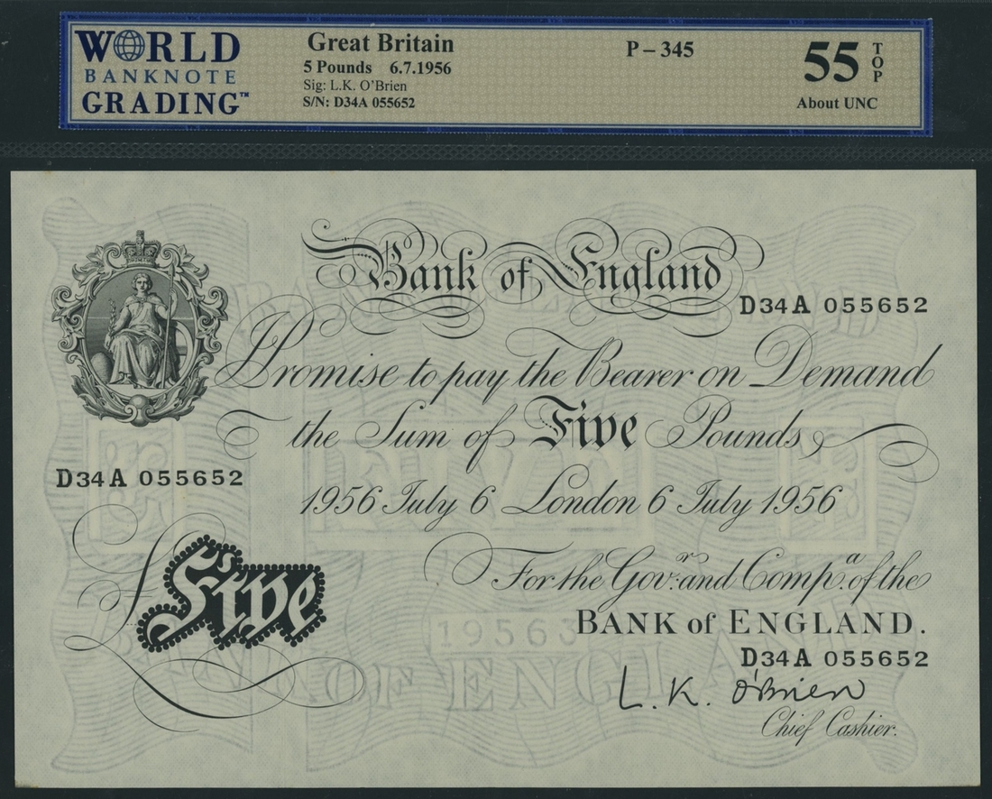 (x) Bank of England, £5, London, 6th July 1956, serial number D34A 055652, (EPM B276, Pick 345), in WBG holder 55 TOP About Uncirculated