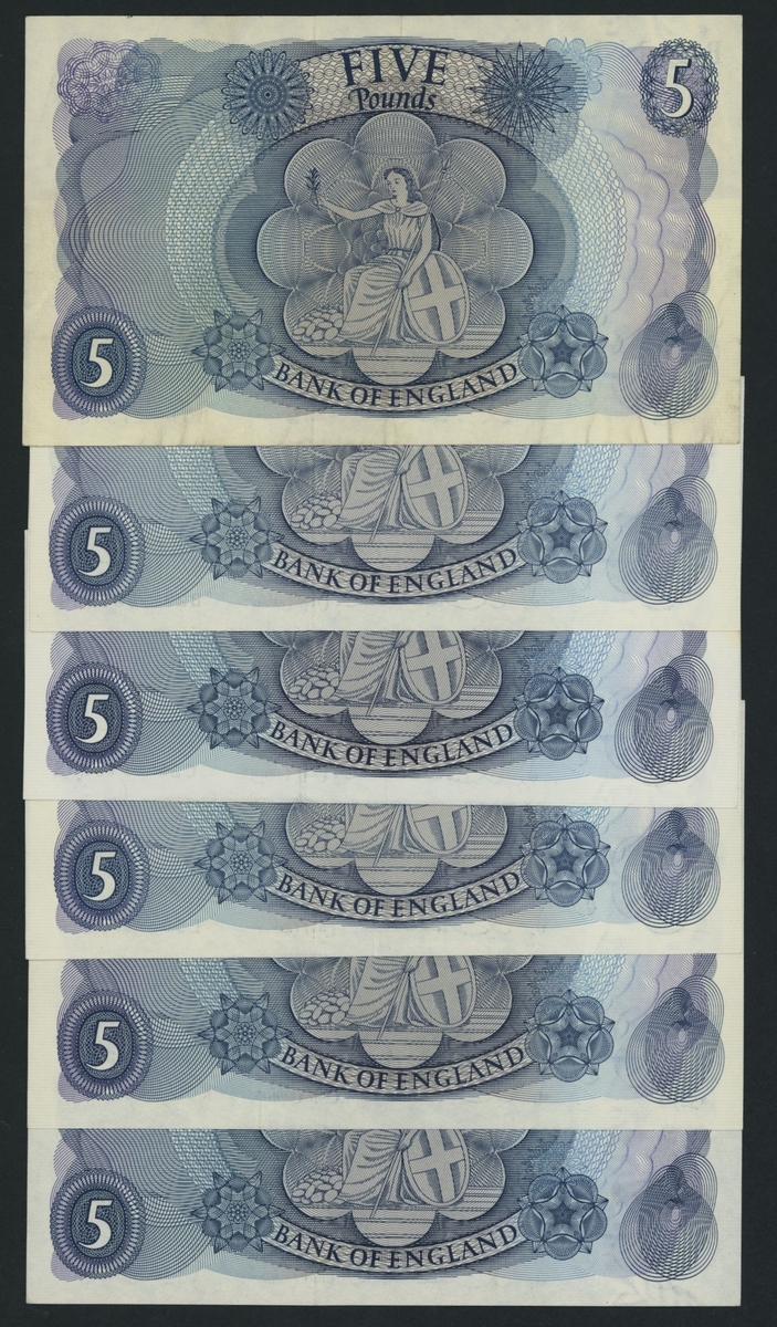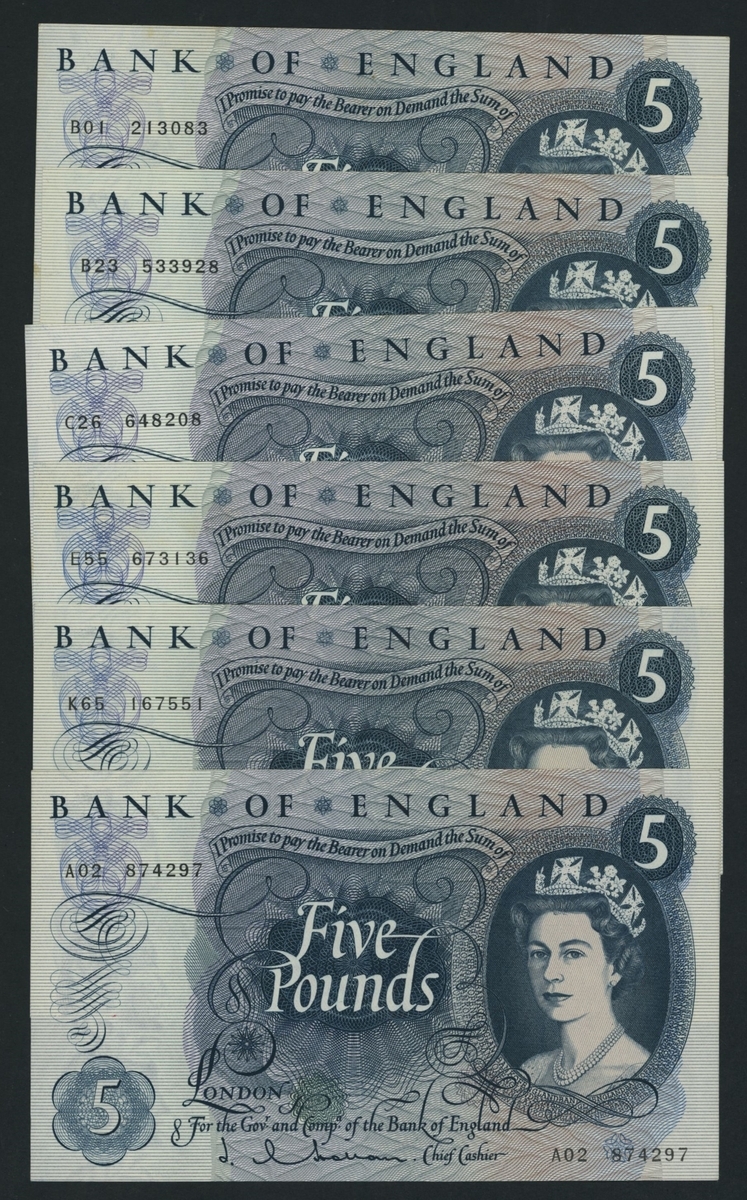 Bank of England, J. Q. Hollom, [6 notes] £5, ND (1963), serial numbers A02 874297, B01 213083, B23 533928, C26 649208, E55 673136 and K65 167551