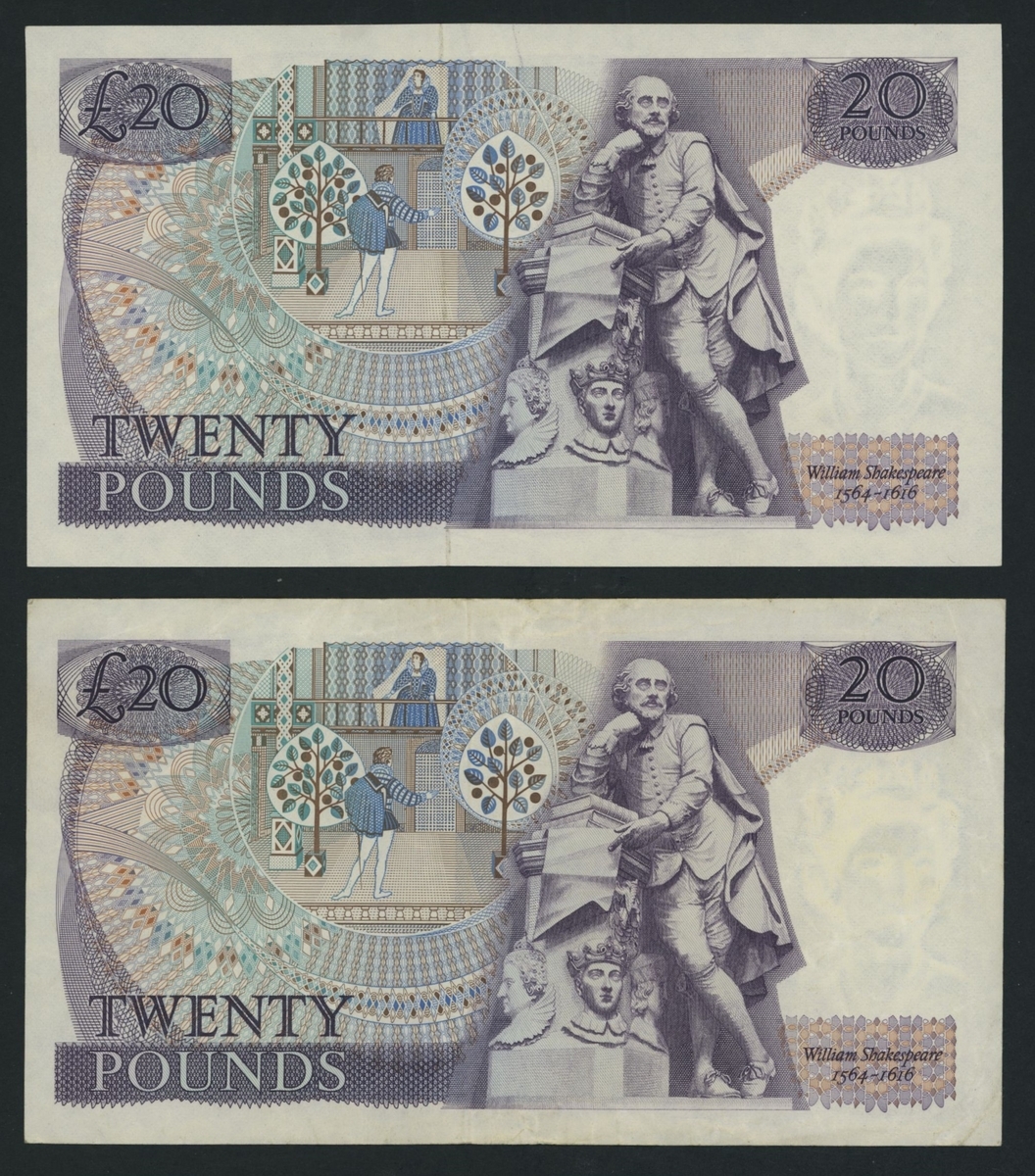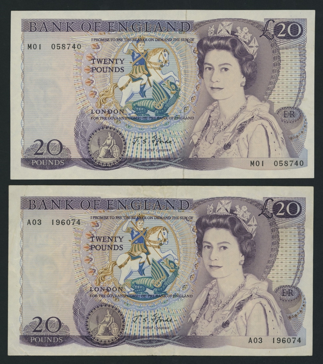 Bank of England, J. S. Fforde, [2 notes] £20, ND (1970), replacement note, serial numbers A03 196074 and M01 058740 (replacement note),
