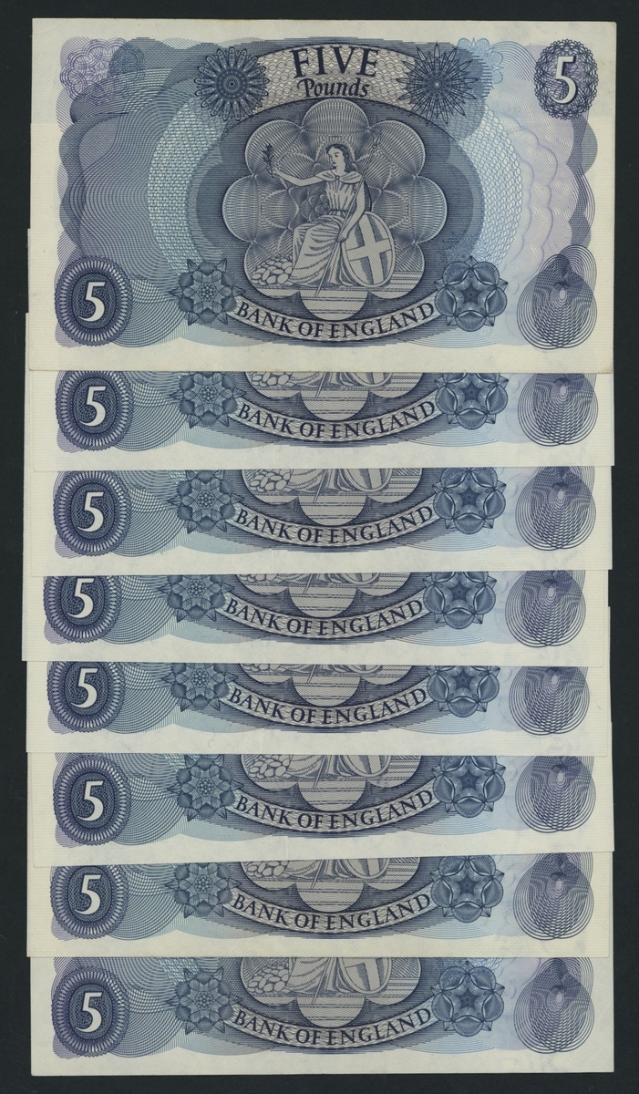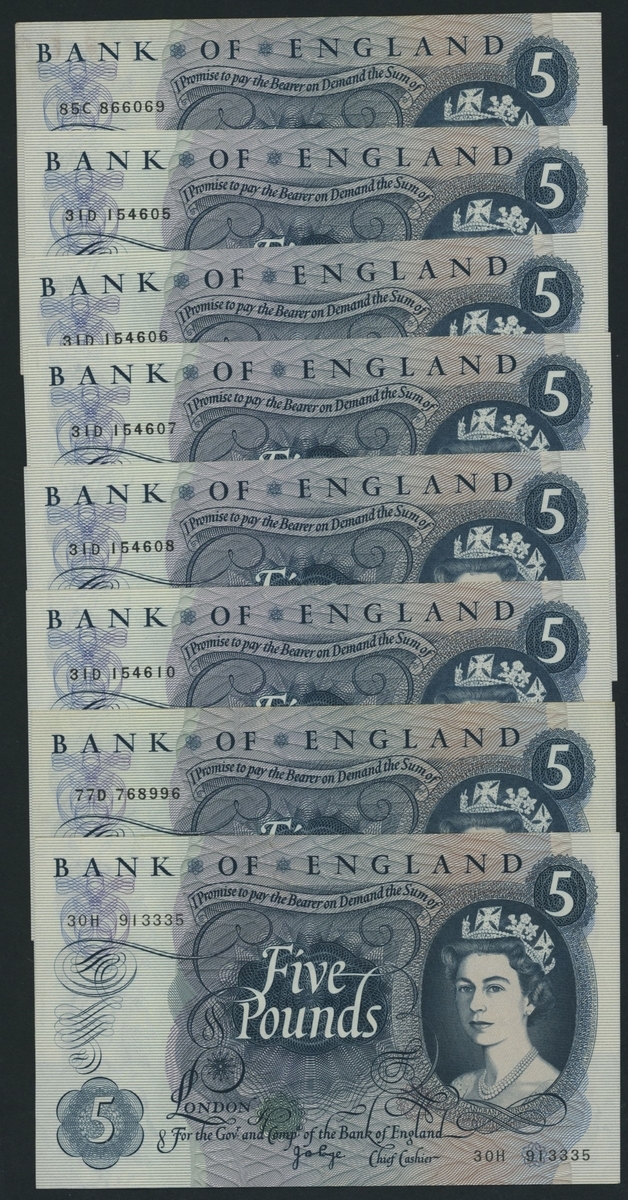 Bank of England, J. B. Page, [8 notes] £5, ND (1971), including first and last series prefixes, first series serial number 85C 866069, consecutive serial numbers 31D 154605-8 and 31D 154610, 77D 768996 and last series serial number 30H 913335,