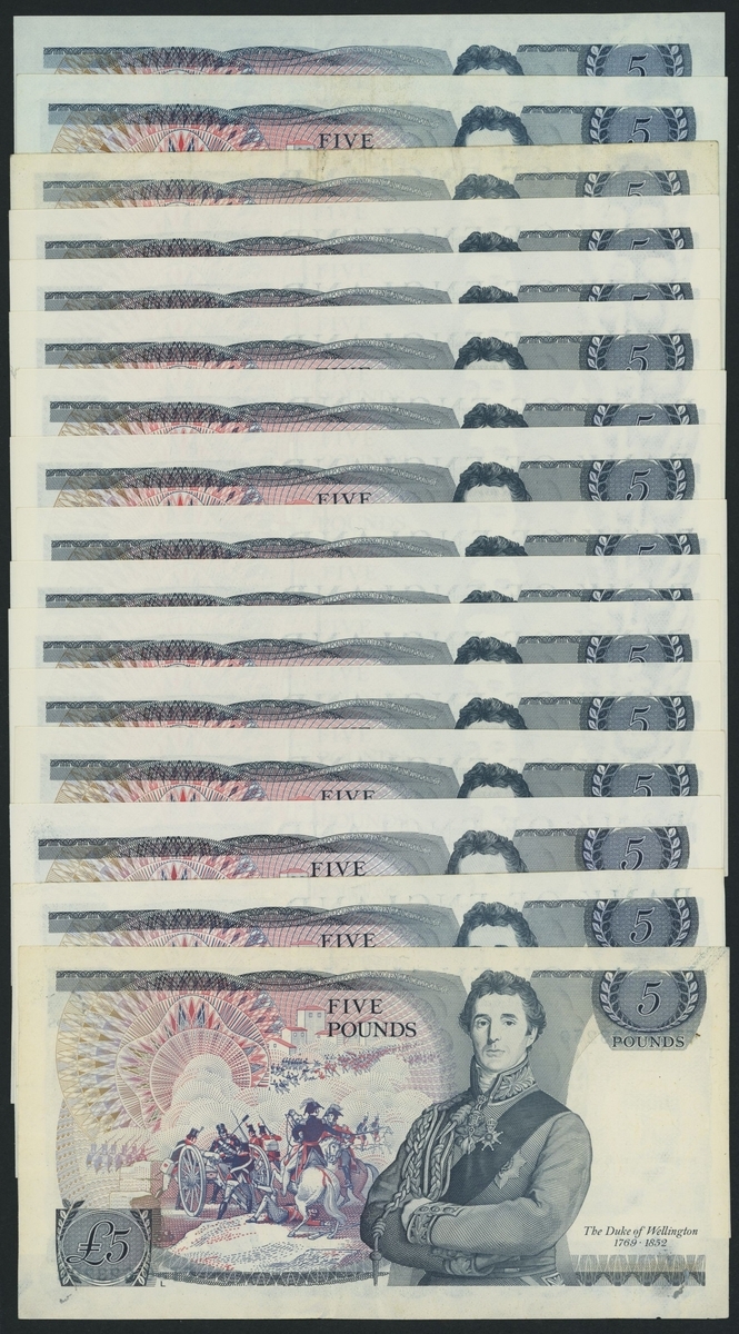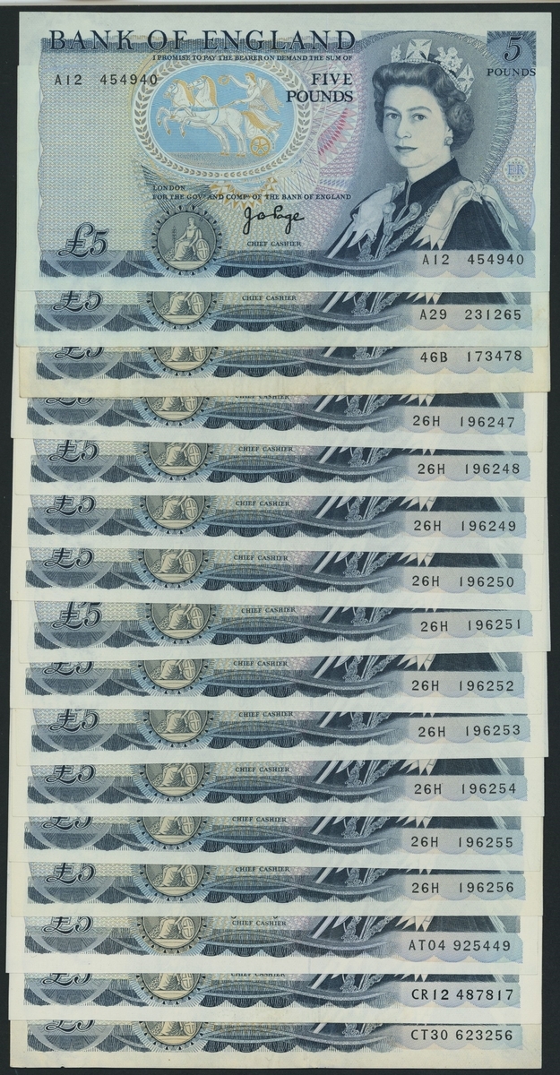 Bank of England, J. B. Page, [16 notes] £5, ND (1971), serial numbers A12 454940 and A29 231265 (first series), 46B 173478, consecutive serial numbers 26H 196427-256, AT04 925449, CR12 487817 and CT30 623256