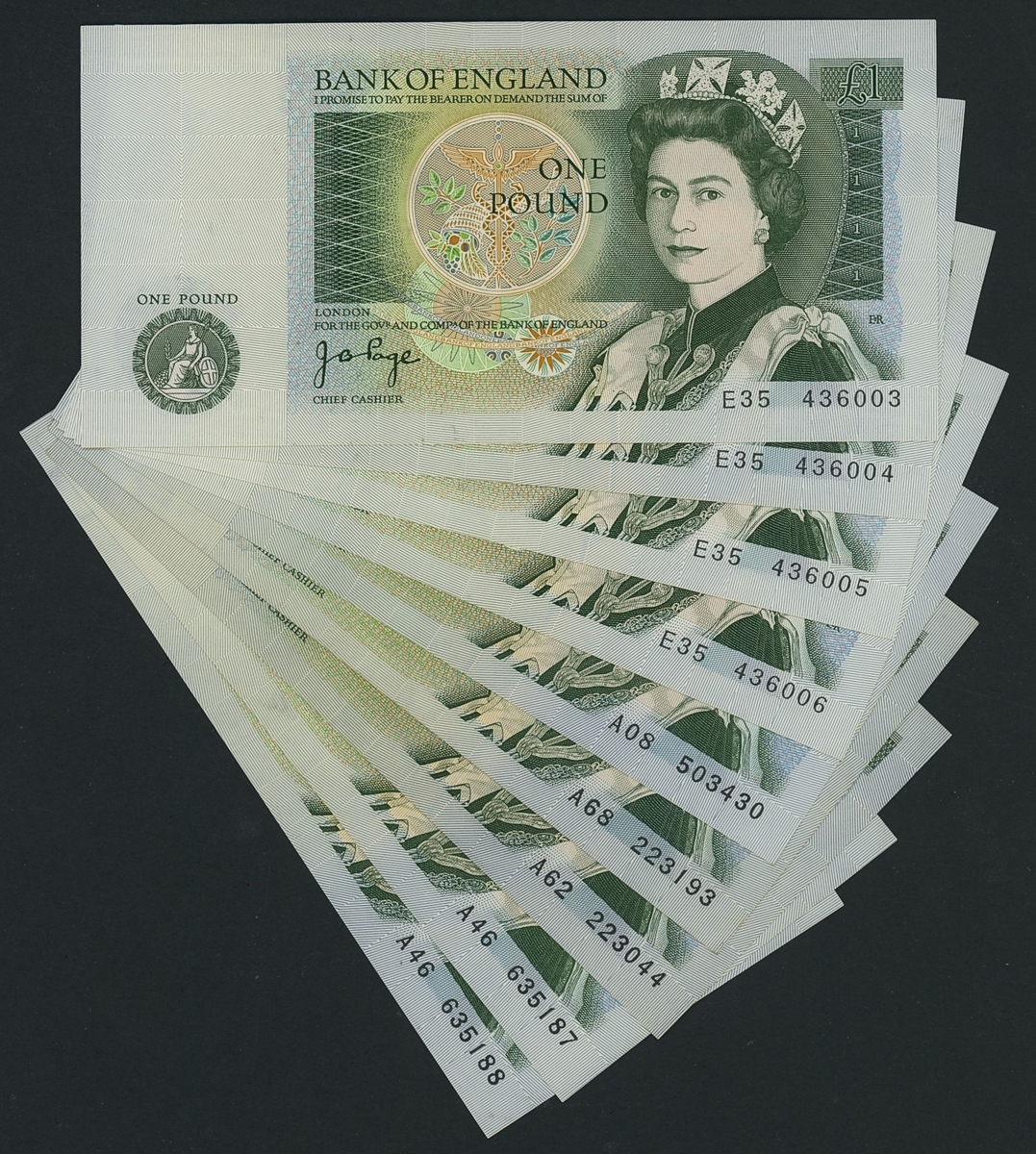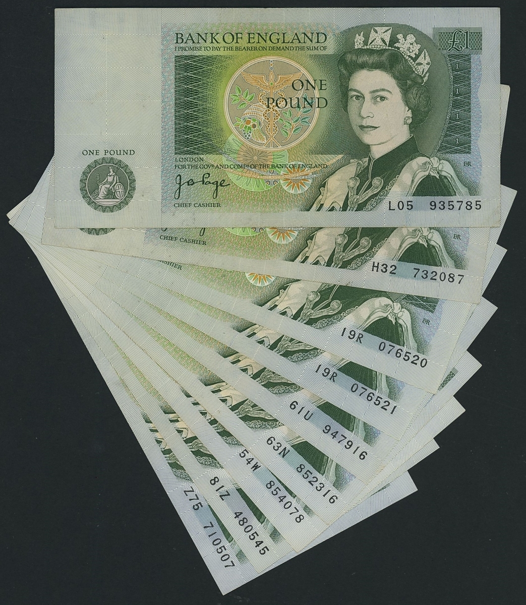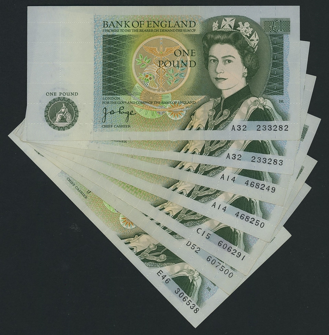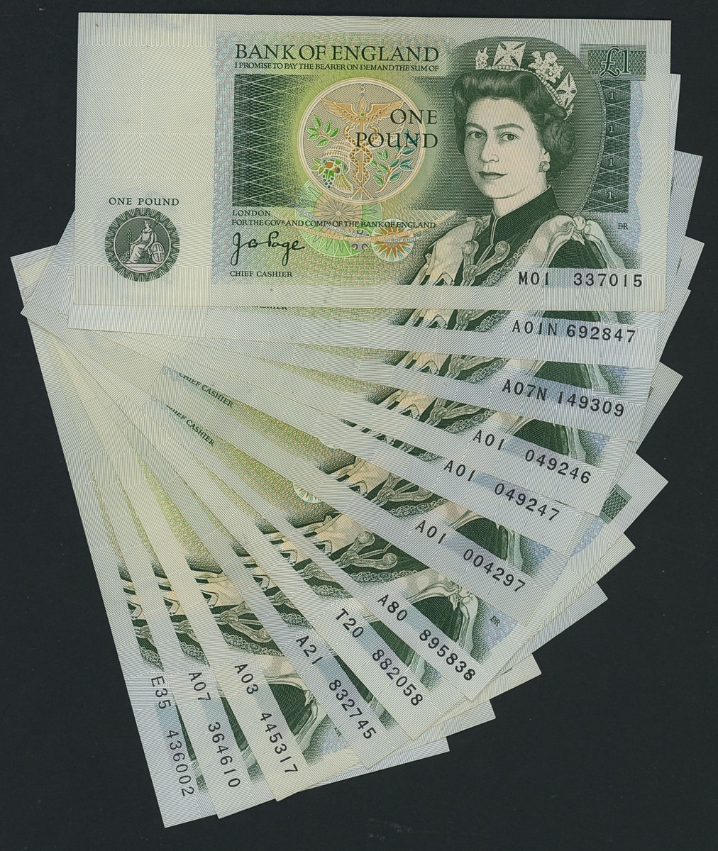 Bank of England, J. B. Page, [38 notes] £1, ND (1978), including first run prefix and last series prefix, as well as some consecutive serial numbers. Lot also includes serial numbers A01N 692847 (first run), A07N 149309 and replacement serial number M01 337015,
