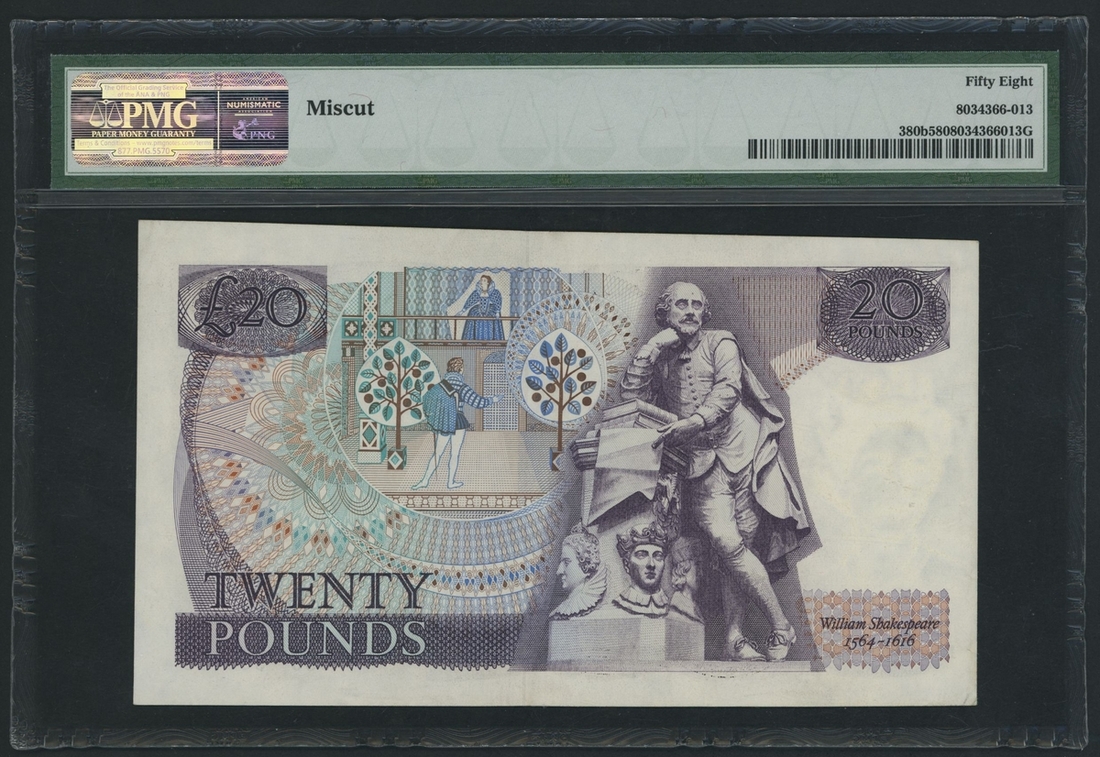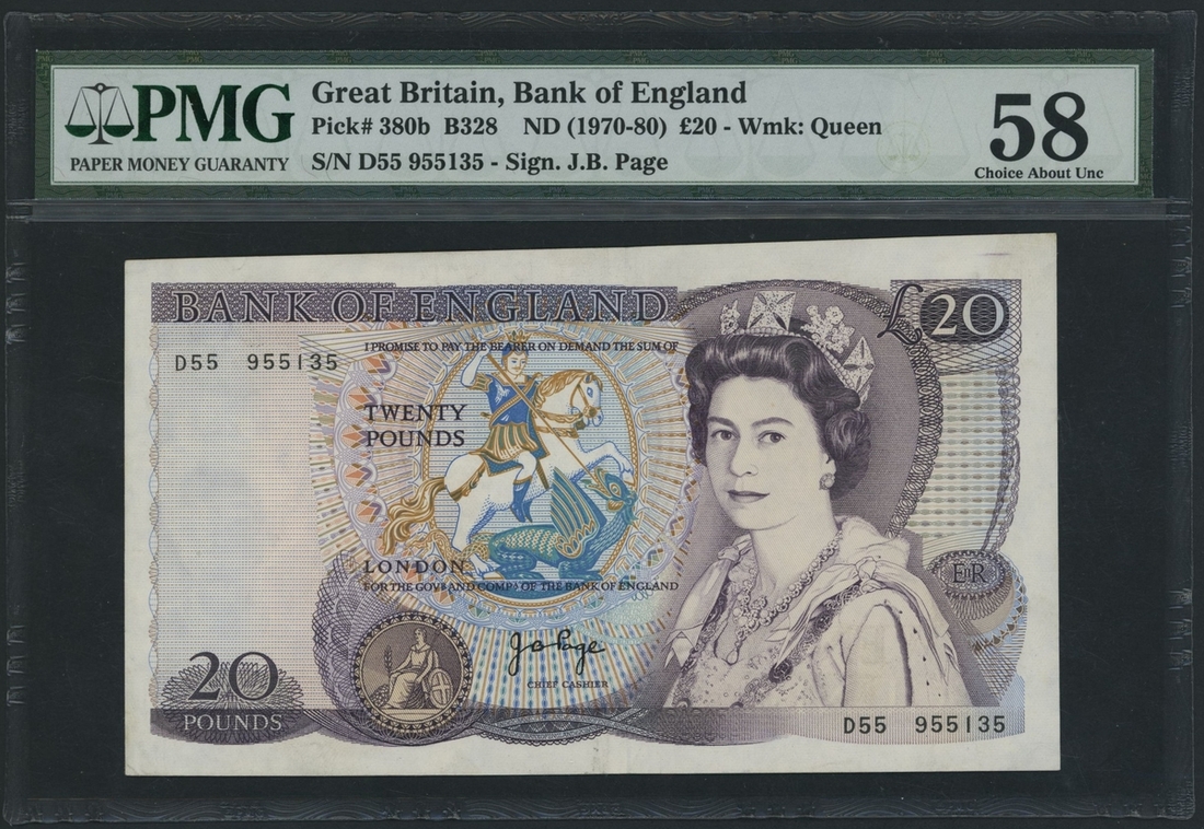 Bank of England, J. B. Page, *ERROR* £20, ND (1970), serial number D55 955135,