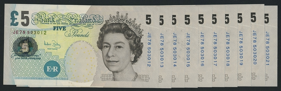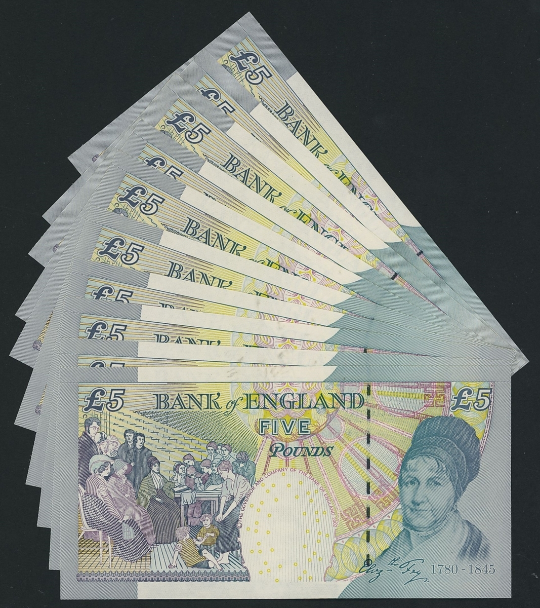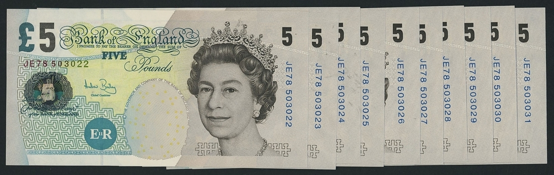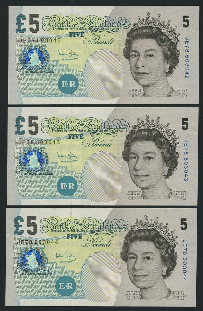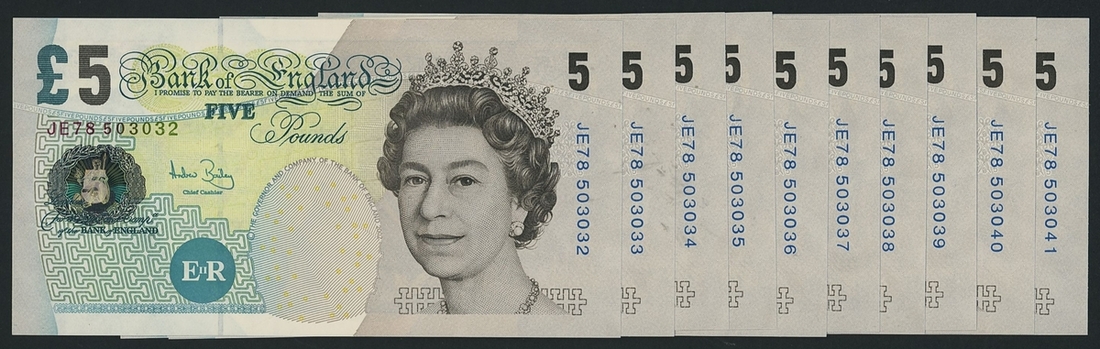 Bank of England, Andrew Bailey, [33 notes] £5, 1990, consecutive serial numbers JE78 503012-44, (EPM B398), uncirculated (33 notes)