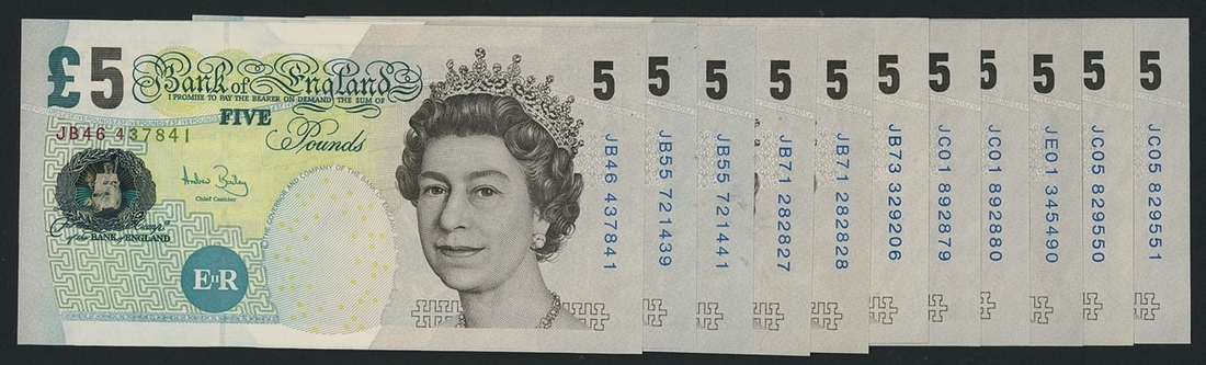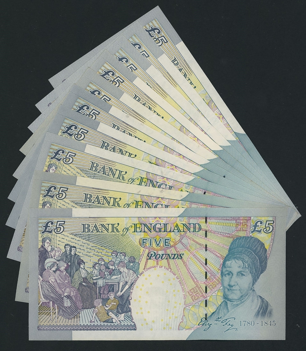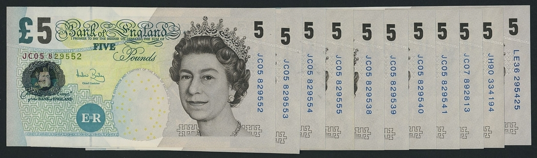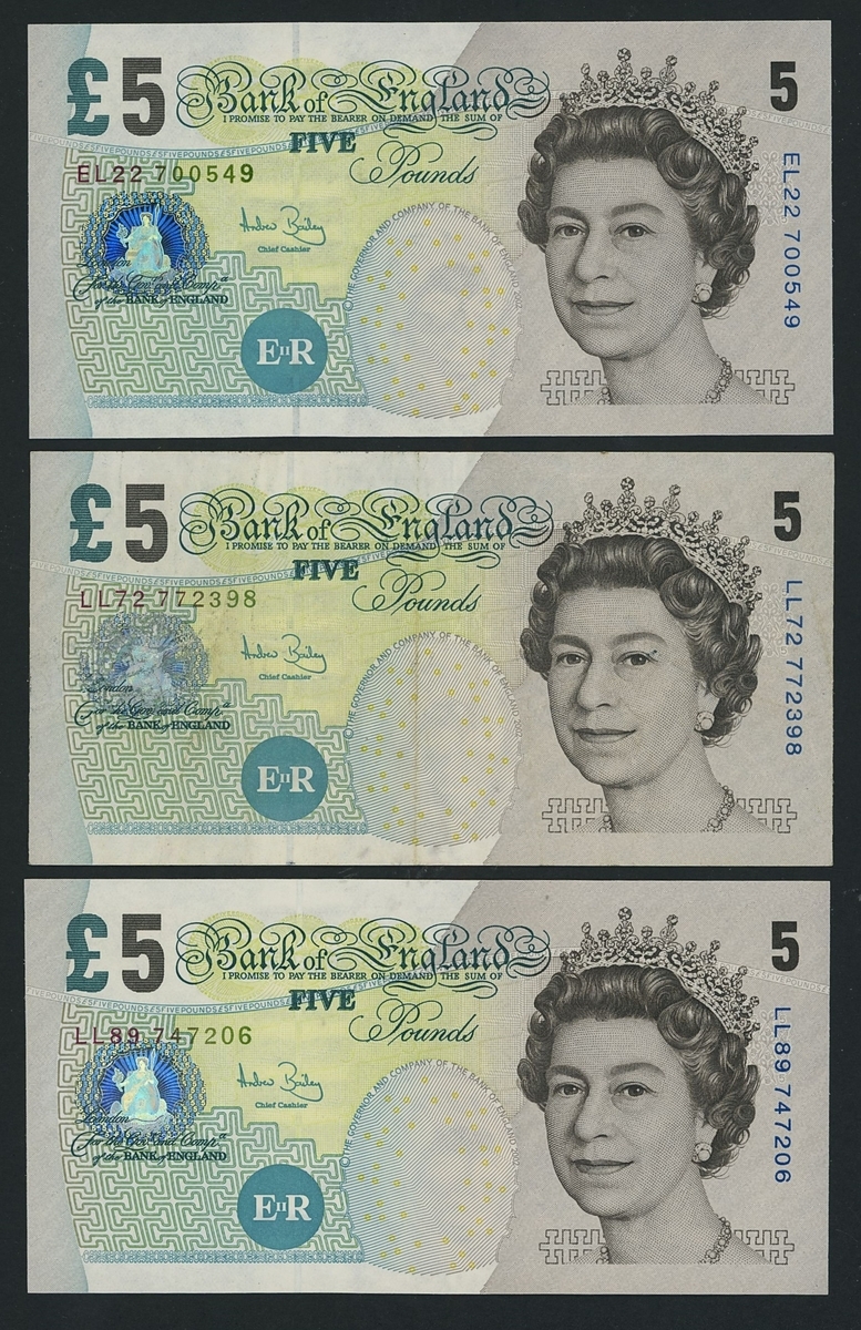 Bank of England, Andrew Bailey, [25 notes] £5, 1990, including first run prefix (JB46), one column sort prefix (EL22), and some consecutive serial numbers. Lot also includes two replacement notes (prefix LL)