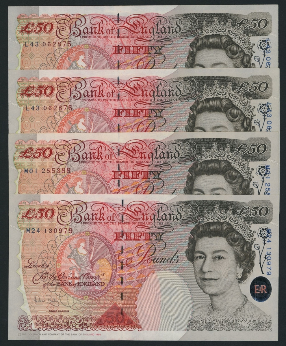 Bank of England, Andrew Bailey, [4 notes] £50, 1994, consecutive serial numbers L43 062875-6 and serial numbers M01 255388 and M24 130979, (EPM B404), extremely fine to uncirculated (4 notes)