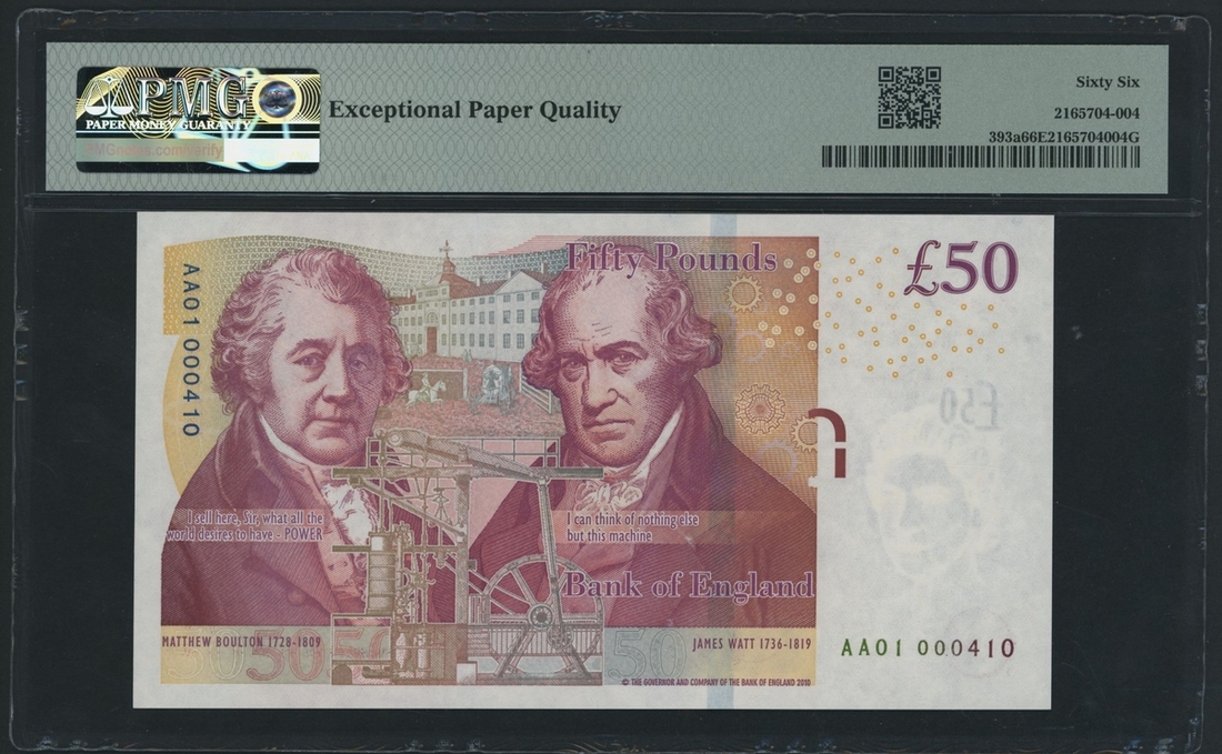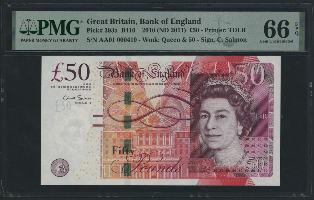 Bank of England, Chris Salmon, £50, 2010 (2011), low serial number AA01 000410, (Pick 393a, EPM B410), in PMG holder 66 EPQ Gem Uncirculated