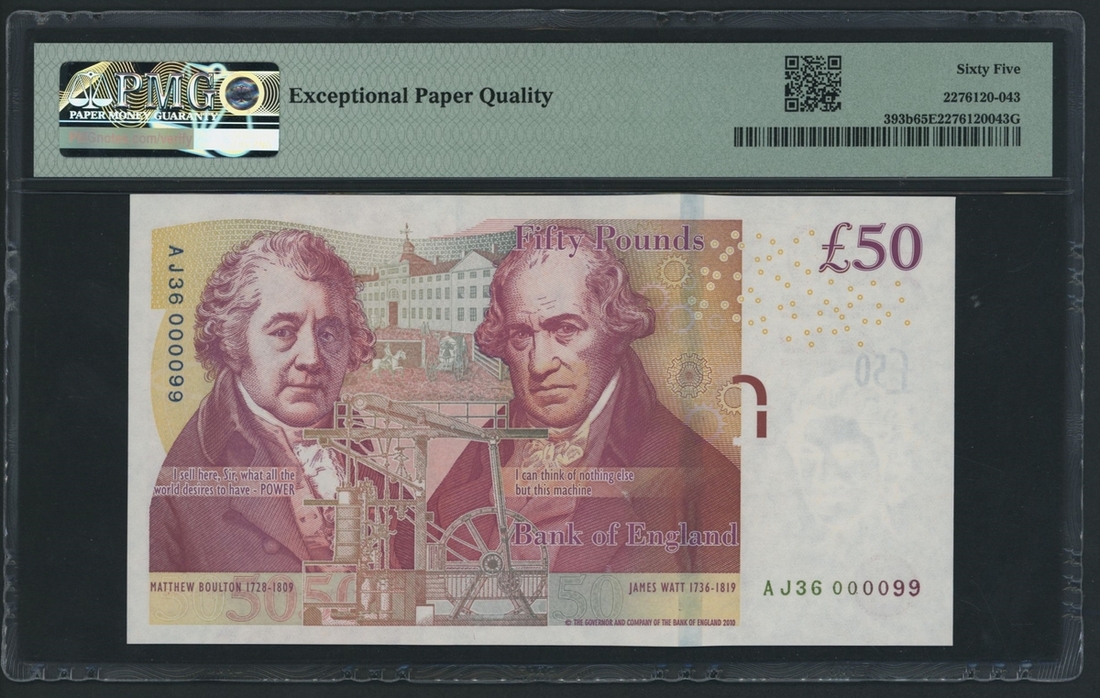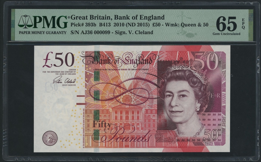 Bank of England, Victoria Cleland, £50, 2010 (2015), low serial number AJ36 000099, (Pick 393b, EPM B413), in PMG holder 65 EPQ Gem Uncirculated