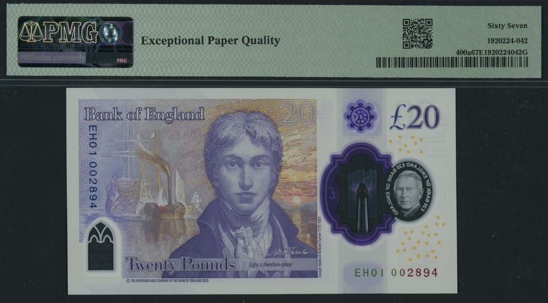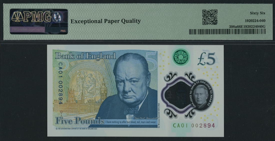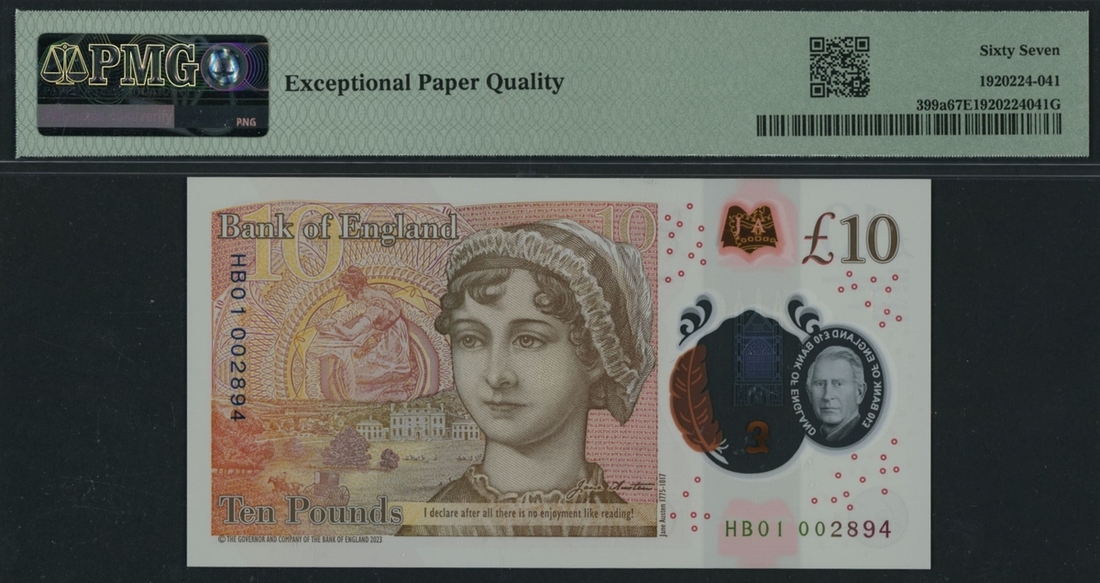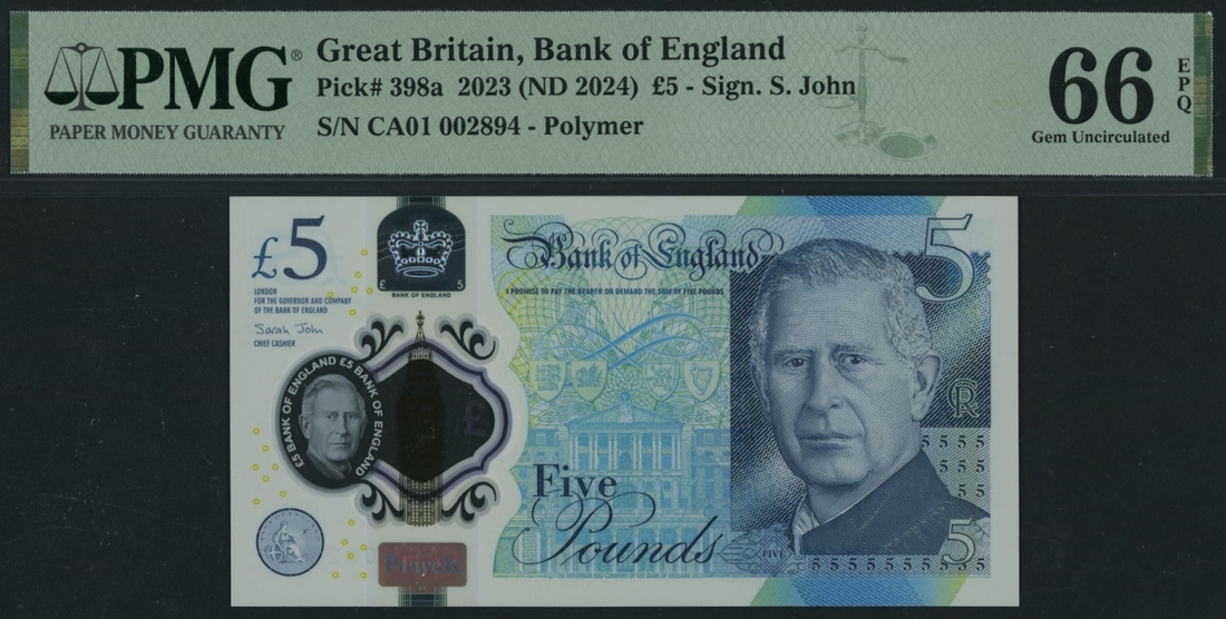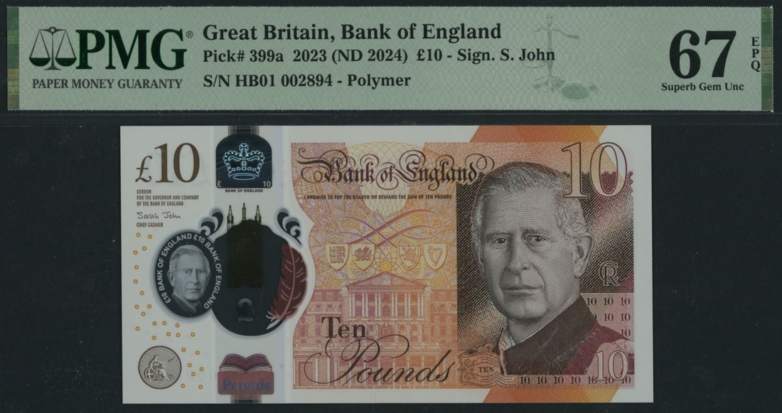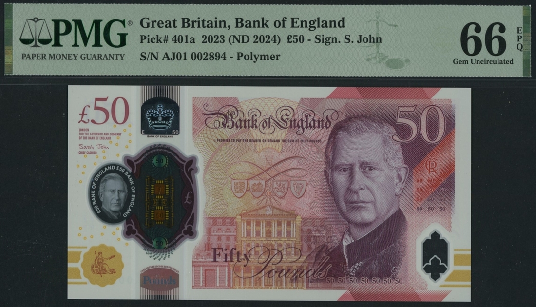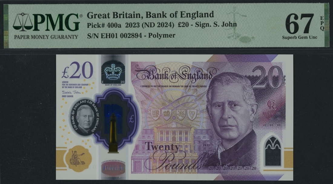 During the summer of 2024, Spink were honoured to host four charity auctions in partnership with the Bank of England. At the same time, sets of the earliest publicly available serial numbers were also on the market. Here, we present one of those ballot sets; the four denominations of the new King Charles III Bank of England notes, with the serial number 01 002894. As of this month (June 2025), Victoria Cleland has been reinstated as the Chief Cashier. Therefore, these are the only King Charles III notes featuring the signature of Sarah John