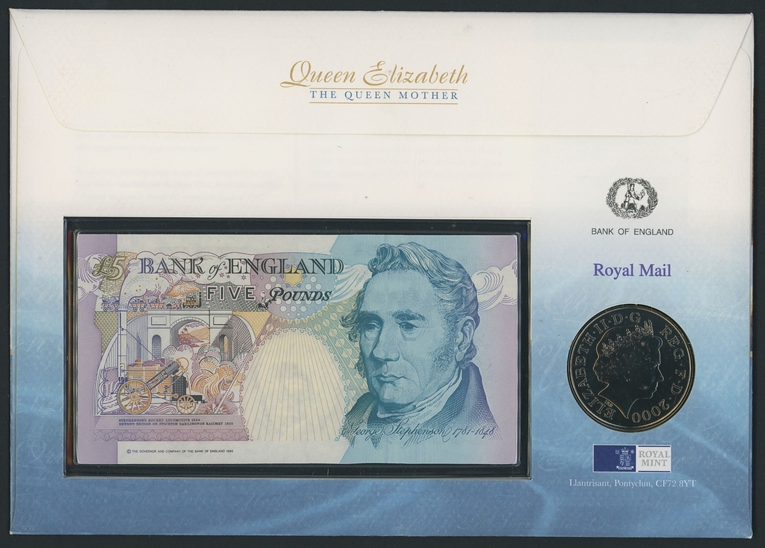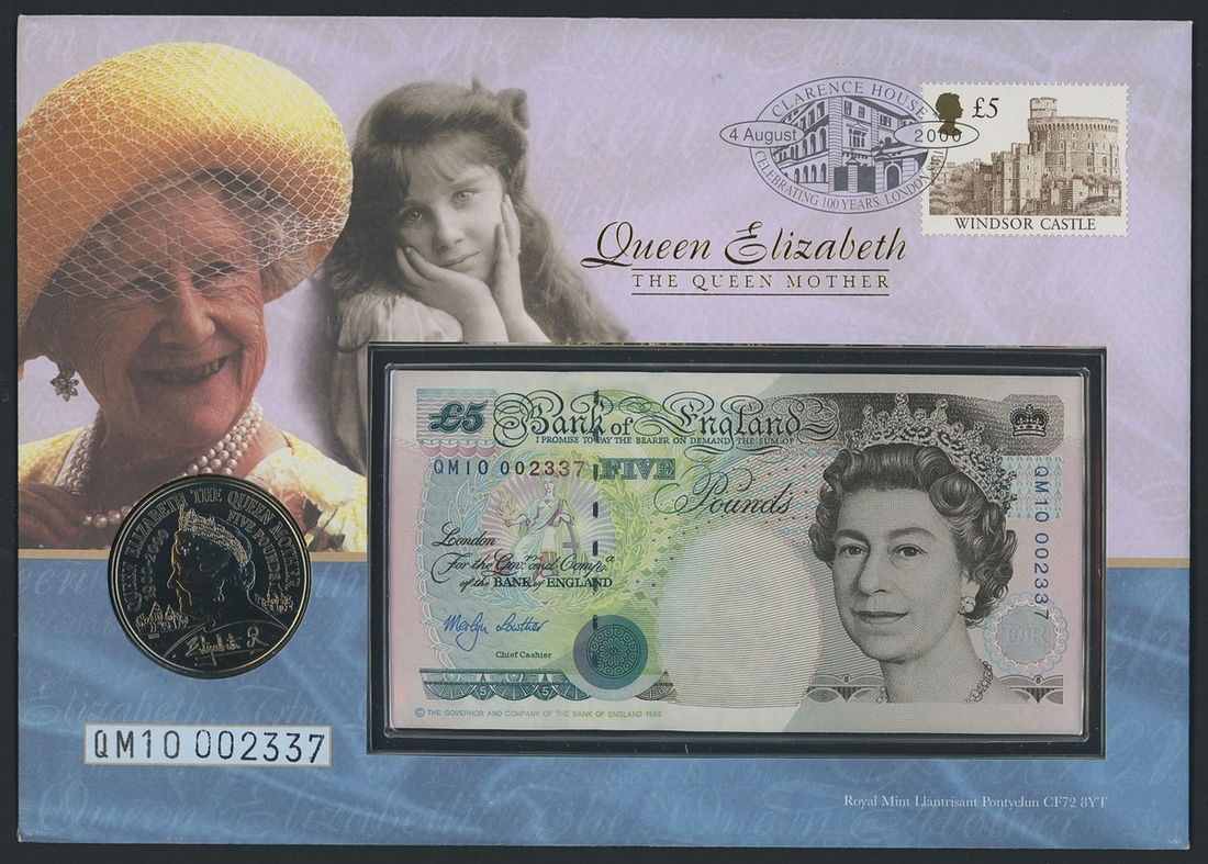 Bank of England, Debden Security Printing, [4 items] Commemorative Notes, Coins, and Stamps sets, HM the Queen Mother's 100th Birthday, £5 (with stamp and cupro-nickel £5 crown), 2000, serial number QM10 002337,