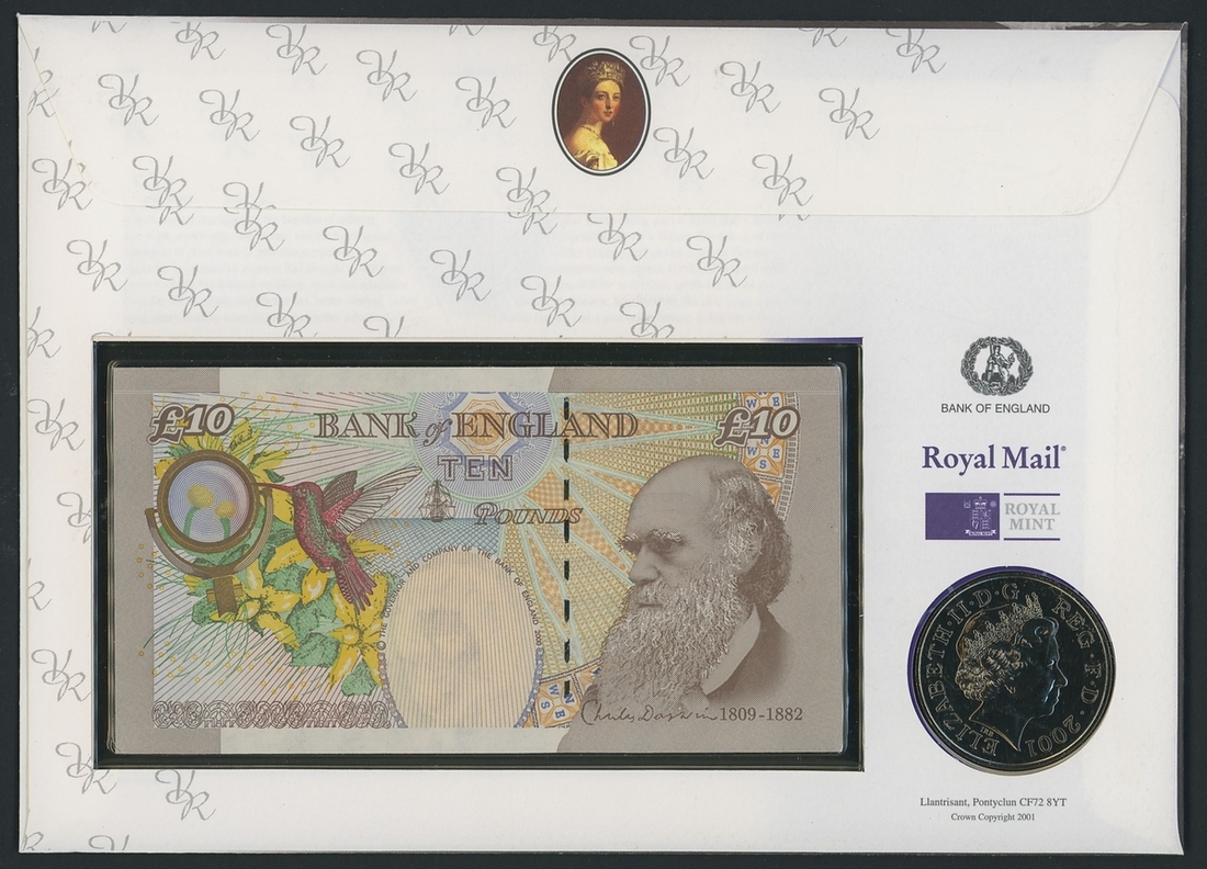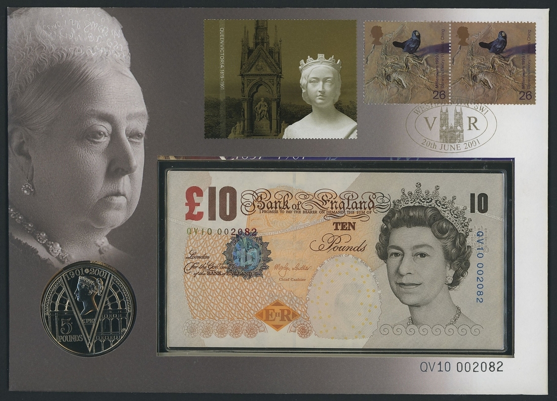 Queen Victoria Centenary end of era, £10 (with stamps and cupro-nickel £5 crown), 2001, serial number QV10 002082,