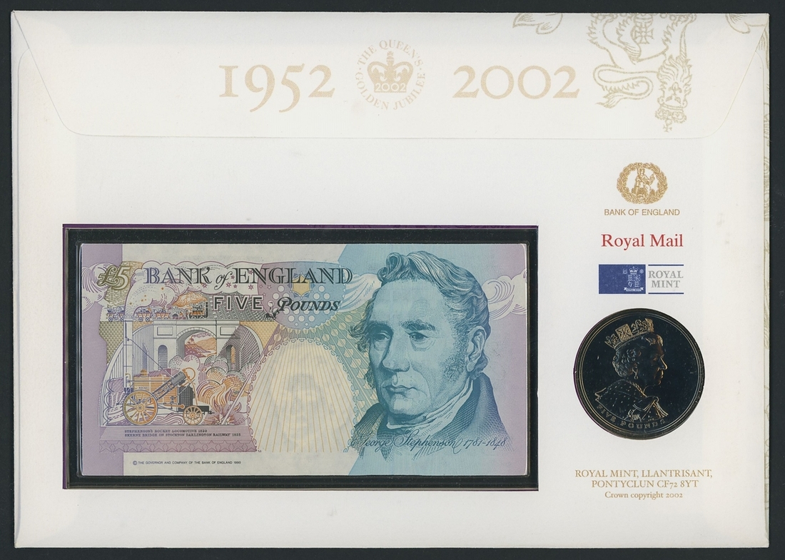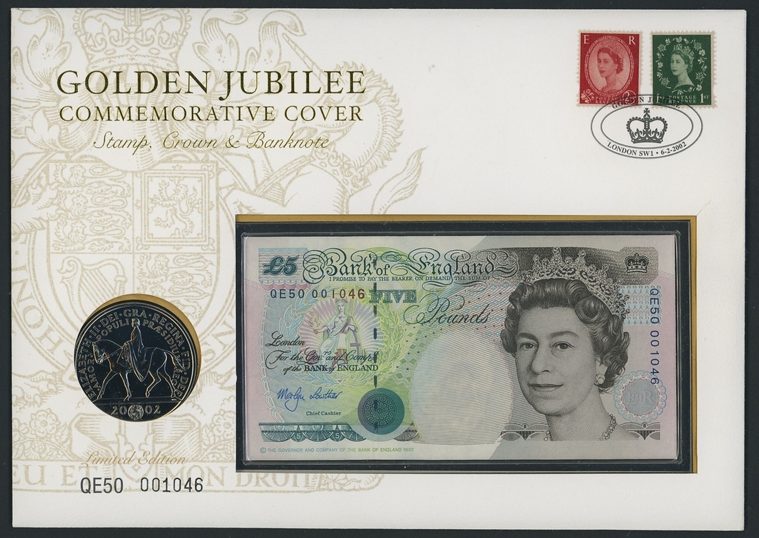 HM the Queen's Golden Jubilee, £5 (with stamps and cupro-nickel £5 crown), 2002, serial number QE50 001046,