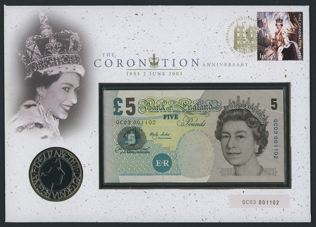 Coronation 50th Anniversary, £5 (with stamp and cupro-nickel £5 crown), 2003, serial number QC03 001102
