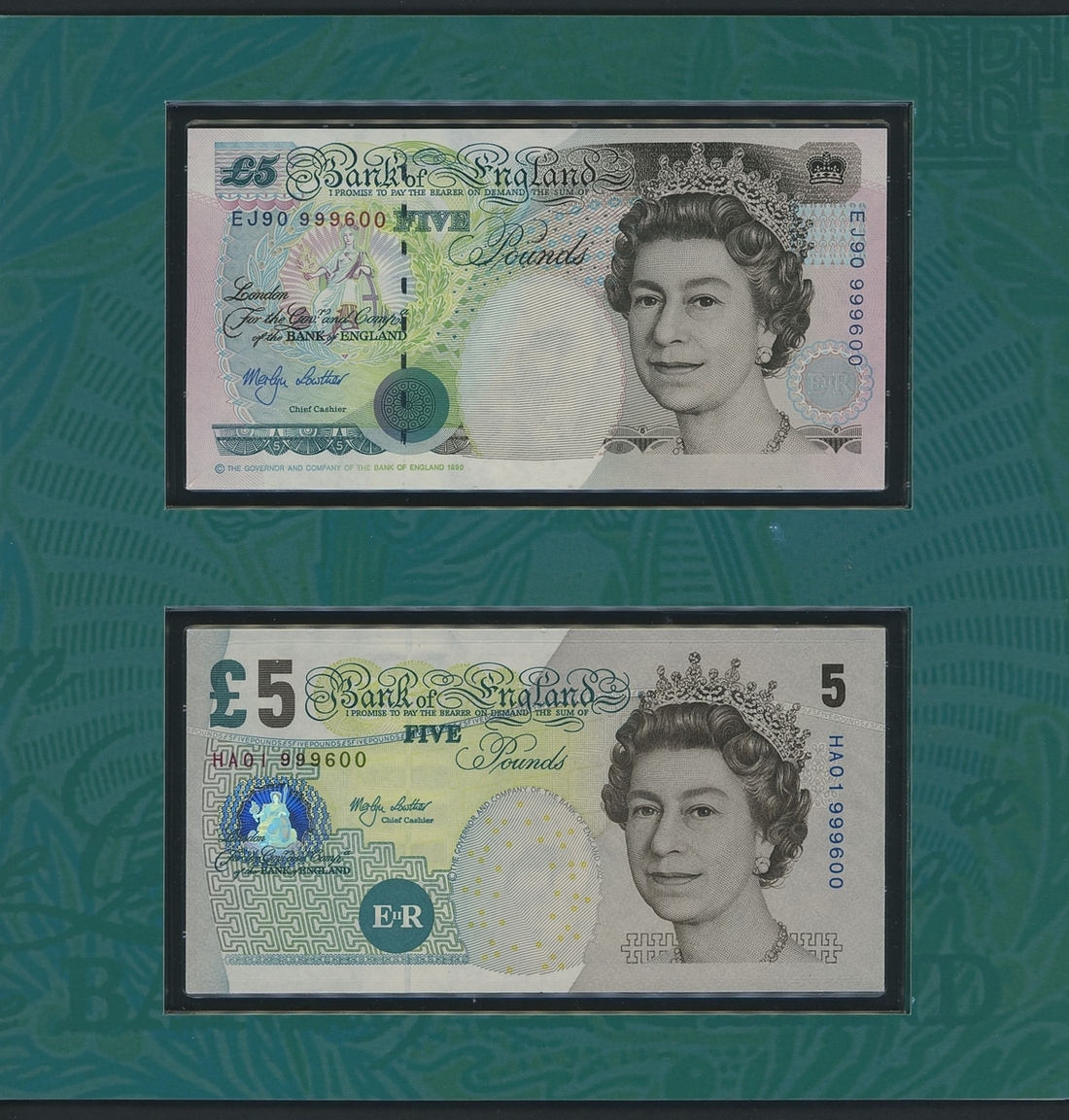 Bank of England, Debden Security Printing, [2 notes] LAST AND FIRST £5, Lowther, 2002, serial numbers EJ90 and HA01 999600