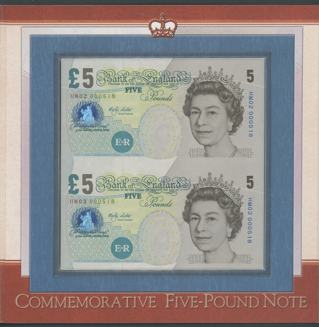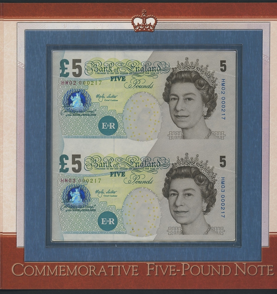 Bank of England, Debden Security Printing, [2 items] Royal Celebration Uncut Pair, 2002, serial numbers HM02 and HM03 000217, and HM02 and HM03 000518