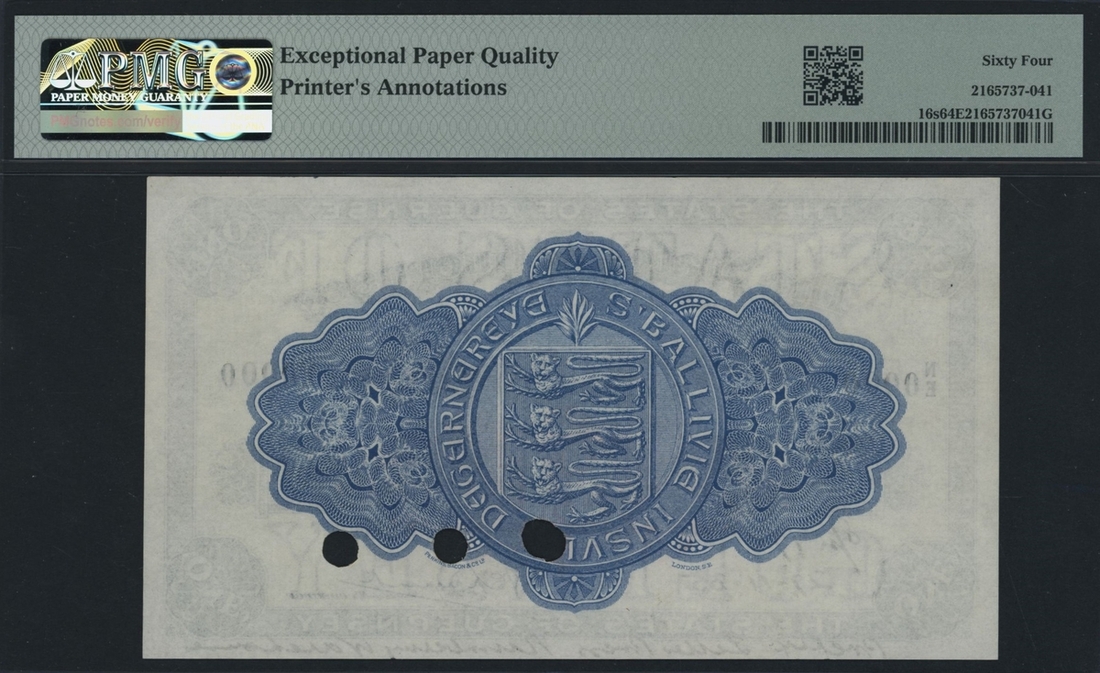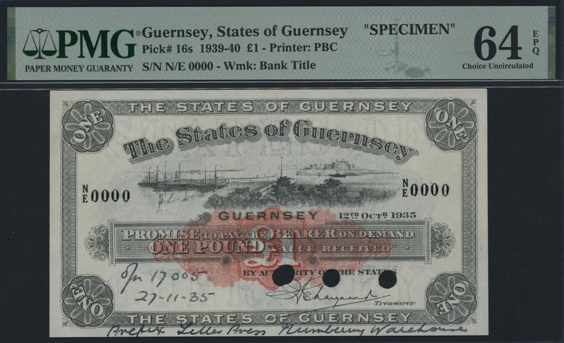 States of Guernsey, *TOP POP* specimen £1, 12th October 1935, serial number N/E 0000, (Pick 16s, BNB 126), in PMG holder 64 EPQ Choice Uncirculated, printer's annotations, the highest grade awarded for this note by PMG