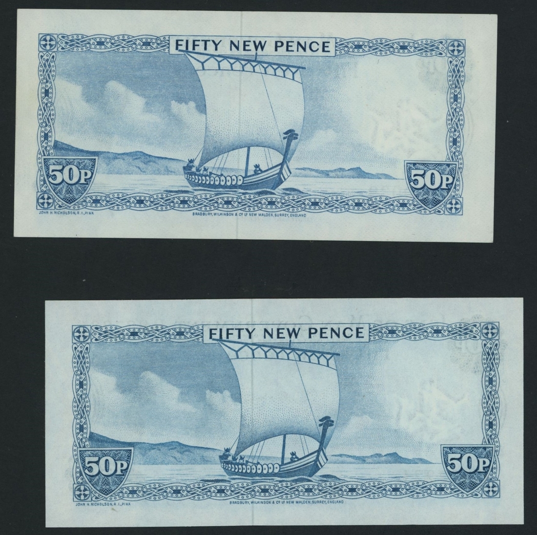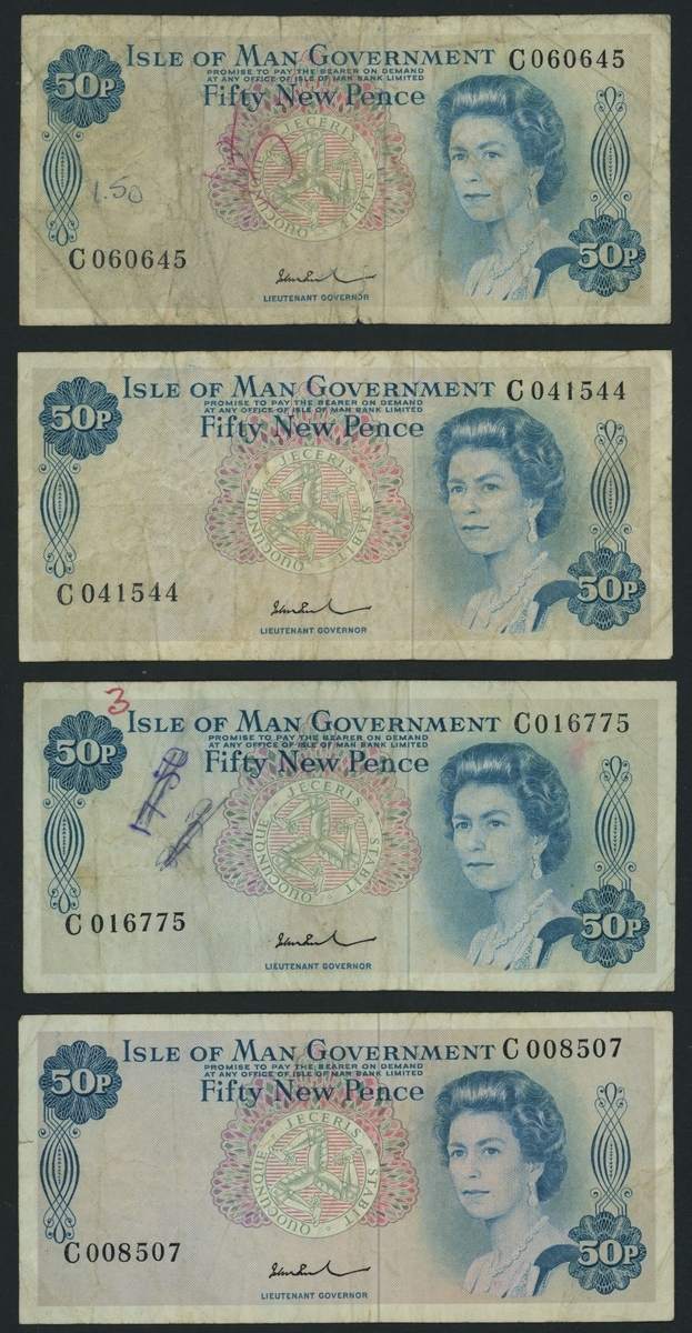 Isle of Man Government, [5 notes] 50 New Pence, ND (1974-80), serial numbers A800039, B827221, C008507, C016775, C041544 and C060645