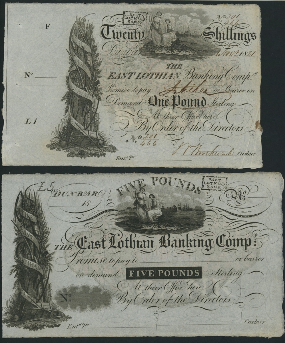 (x) East Lothian Banking Company, [2 notes] £1, proof £5, circa. 1800s, £1, 1st November 1821, serial number 201/466, part issued, F plate,