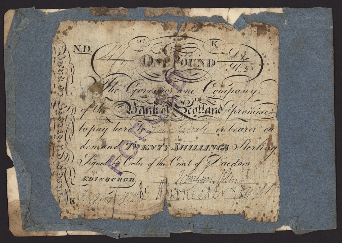 (x) Bank of Scotland, Contemporary Forgery, £1, Edinburgh, 1st August 1812, serial number 41/82, An interesting historical item, this is a forgery created by a French prisoner of war held in Edinburgh Castle and Penicuik during the Napoleonic wars. These POWs used bone and wood to make dies and seals to create the notes,