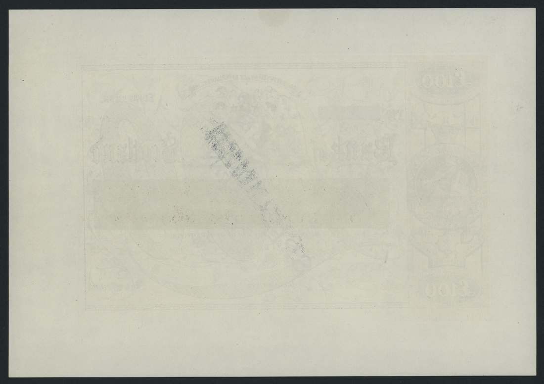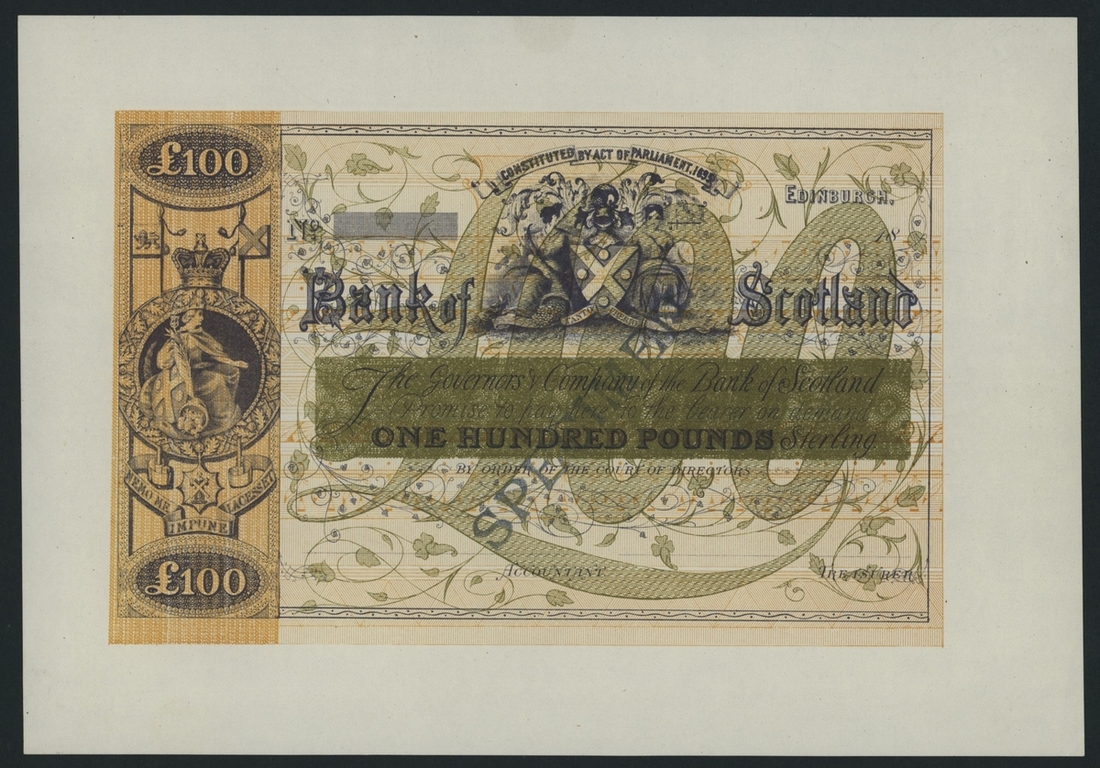 (x) Bank of Scotland, essay £100, Edinburgh, dated 18--, a beautiful example of the Bradbury & Evans engraving (the predecessor of Bradbury Wilkinson & Co.), this olive-green colour trial was created when the bank approached Bradbury & Evans for possible printing. The results are striking and unusual in design for the time,