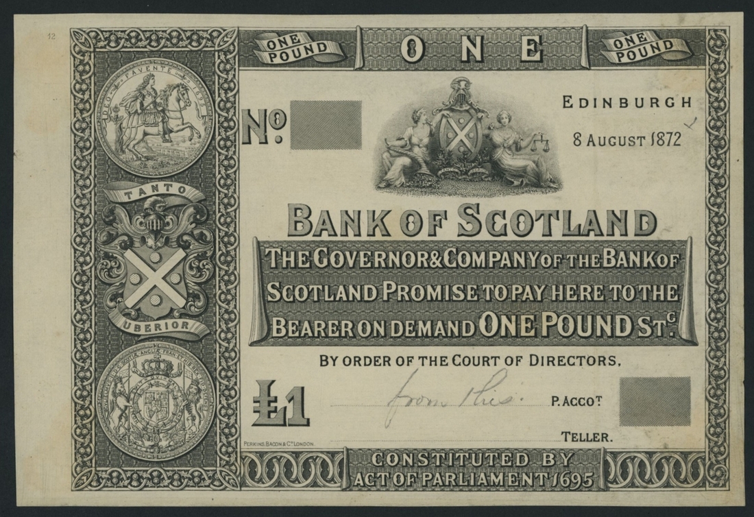 (x) Bank of Scotland, proof £1, Edinburgh, 8th August 1872, pencil annotation on obverse, Perkin's, Bacon & Co. engraving, '12' in the upper left margin,