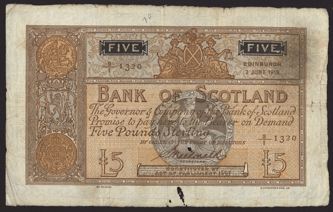 (x) Bank of Scotland, £5, Edinburgh, 3rd June 1919, serial number 2/1 1320, (PMS BA 90d), fine, internal tear, stamp on reverse