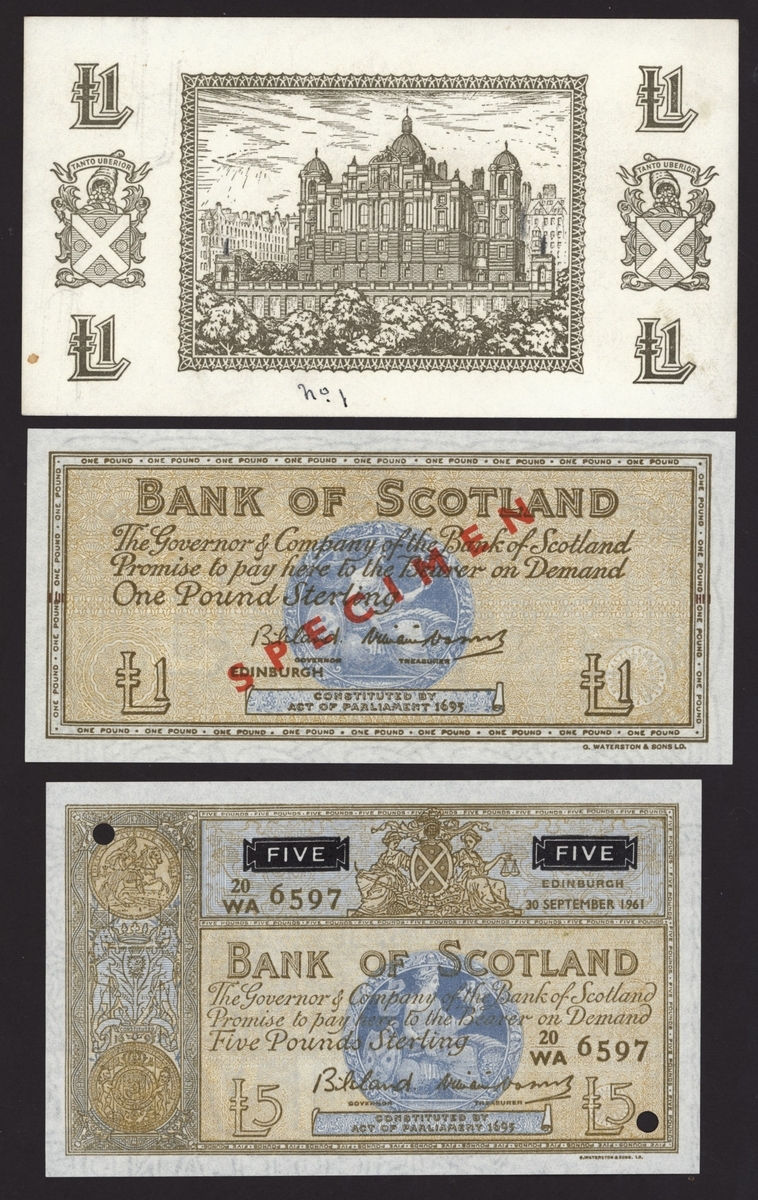 (x) Bank of Scotland, [3 notes] £1, £5, proof and specimens,