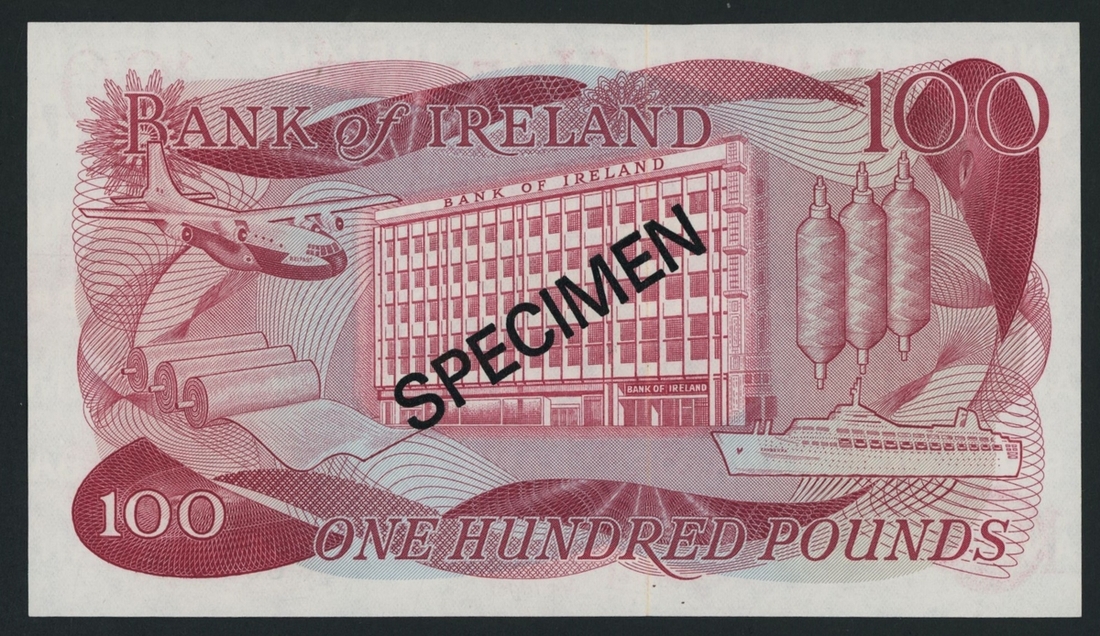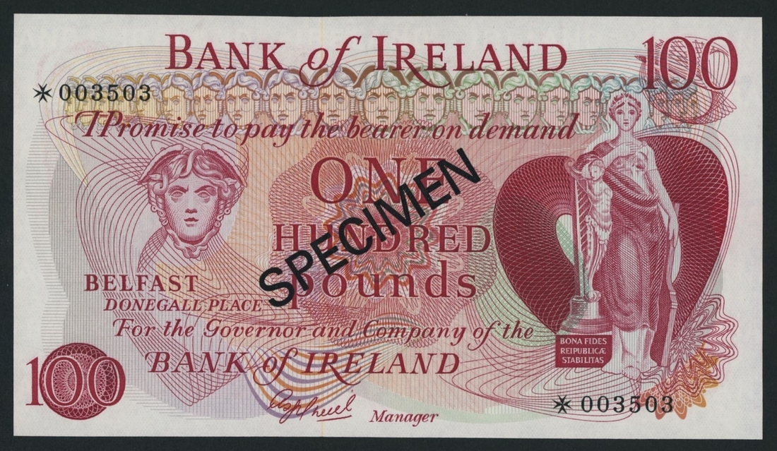 Bank of Ireland, specimen £100, Belfast, ND (1978), serial number *003503, inclusion of Maltese cross as serial number prefix,