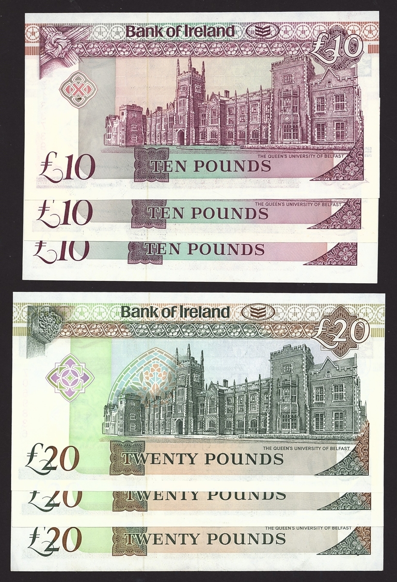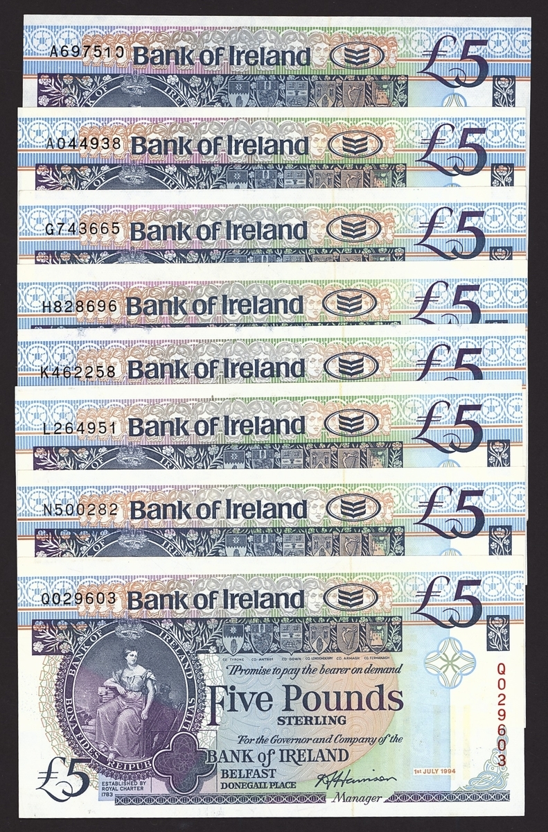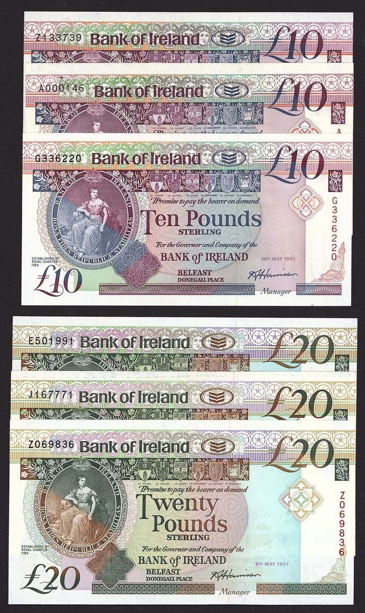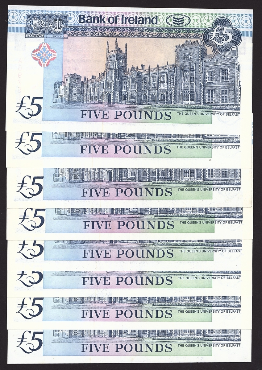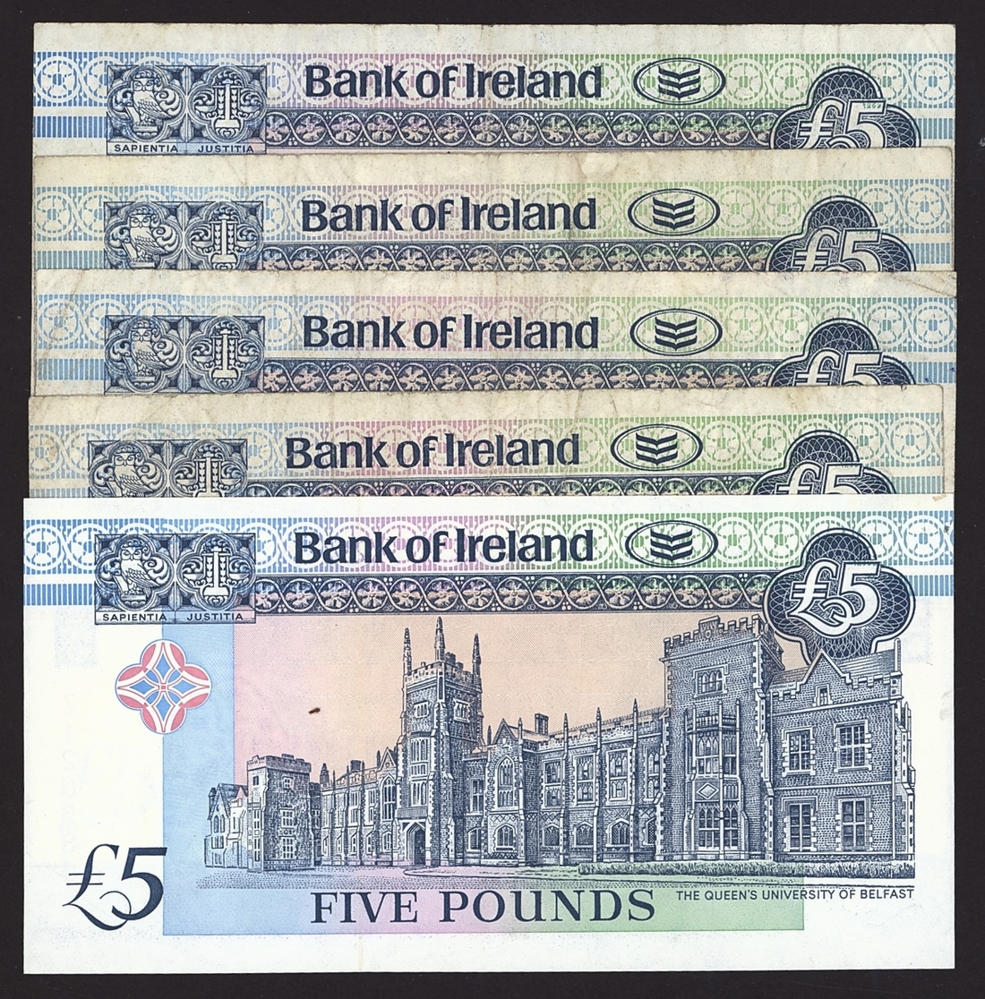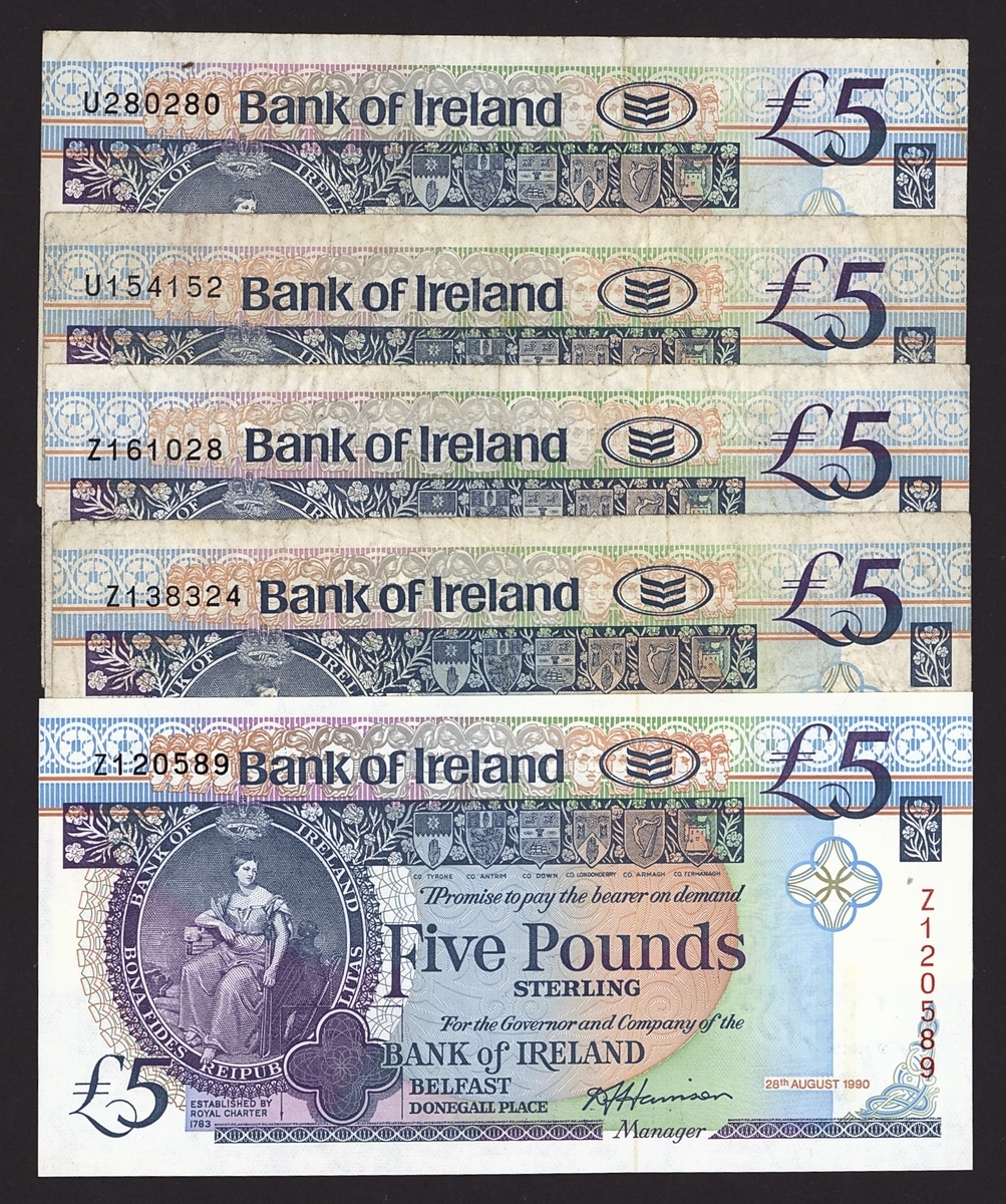 Bank of Ireland, [19 notes] £5, £10, £20, Belfast, 1990-94, £5 (13), 1990-1994, including replacements,