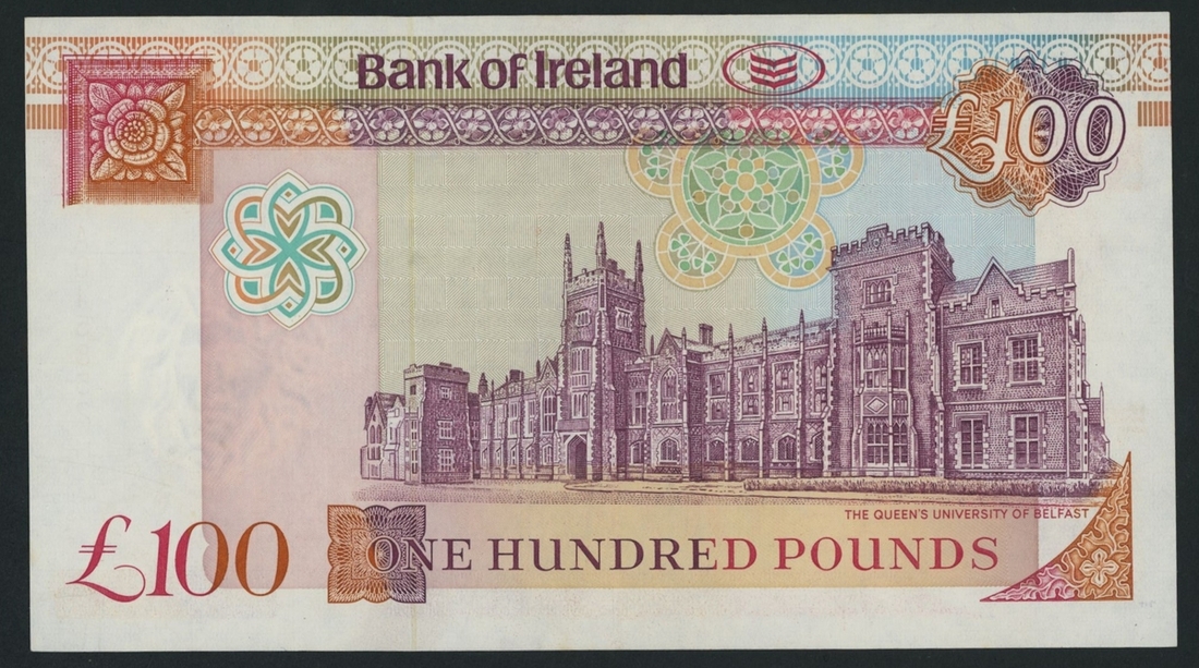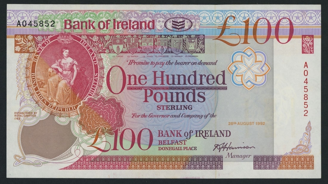 Bank of Ireland, £100, 28th August 1992, serial number A045852, (PMI BA 130), good about uncirculated