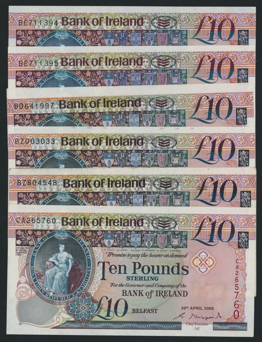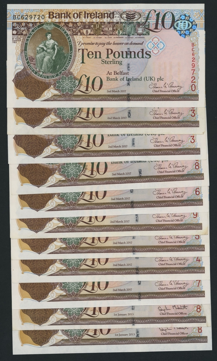 Bank of Ireland, [17 notes] £10, Belfast, 2005-2017, including some consecutive serial numbers and low serial number (AA000228),
