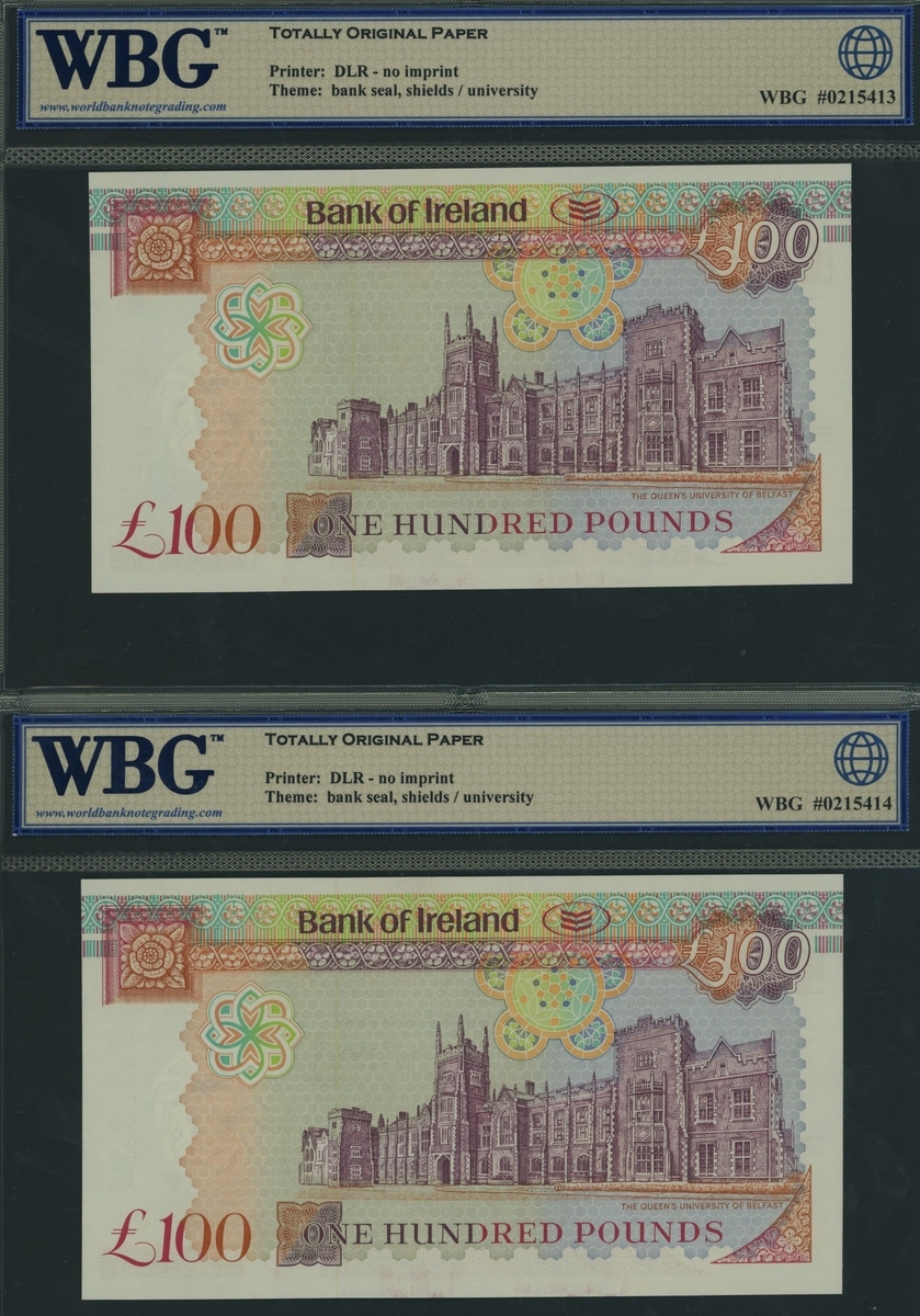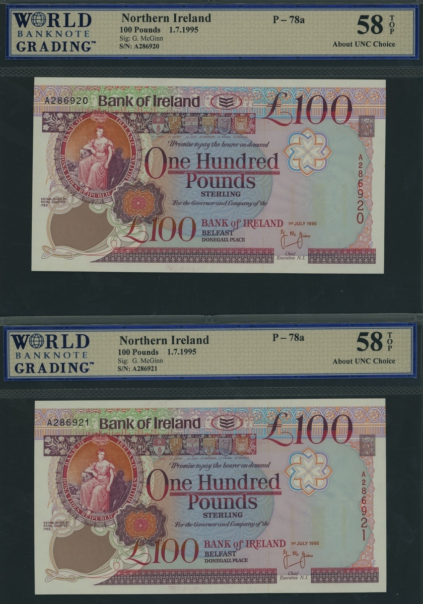 (x) Bank of Ireland, Northern Ireland, [2 notes], £100, Belfast, 1st July 1995, serial number A286920, 21, (PMI BA140, Pick 78a), in WBG holder 58 TOP About Uncirculated Choice (2 notes)