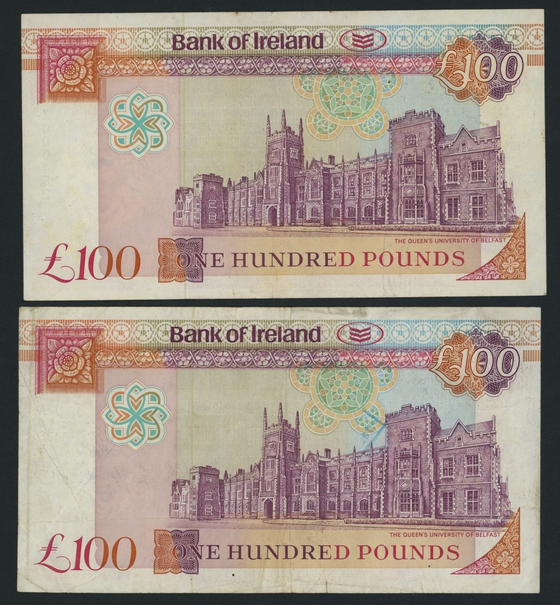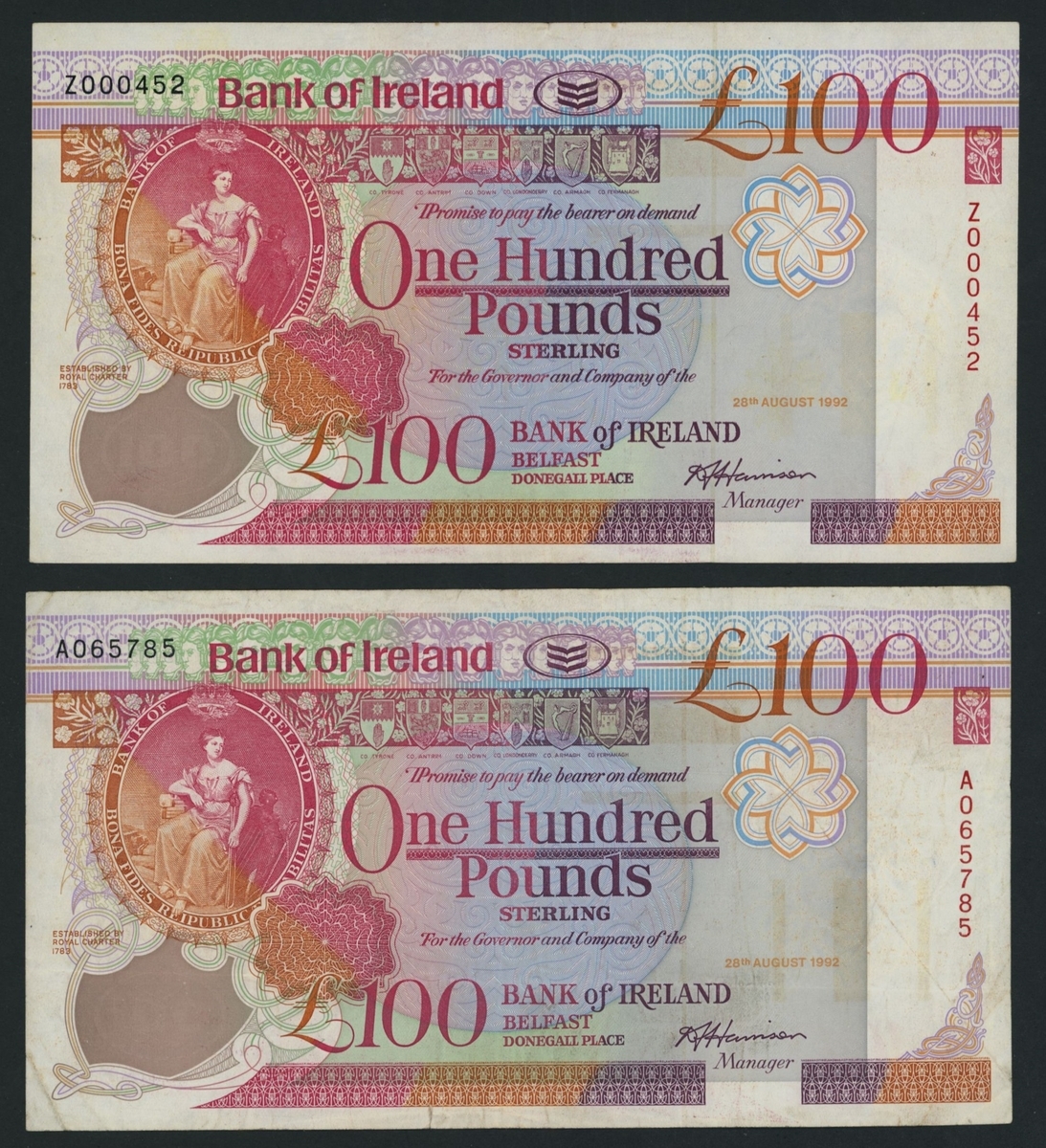 Bank of Ireland, [2 notes], £100, 28th August 1992, serial numbers A065785 and replacement note serial number Z000452, (PMI BA 130, 130r), small tear at bottom of note, otherwise about good fine, staining, otherwise about extremely fine (2 notes)
