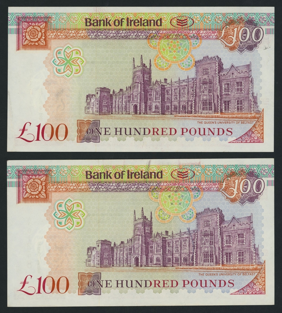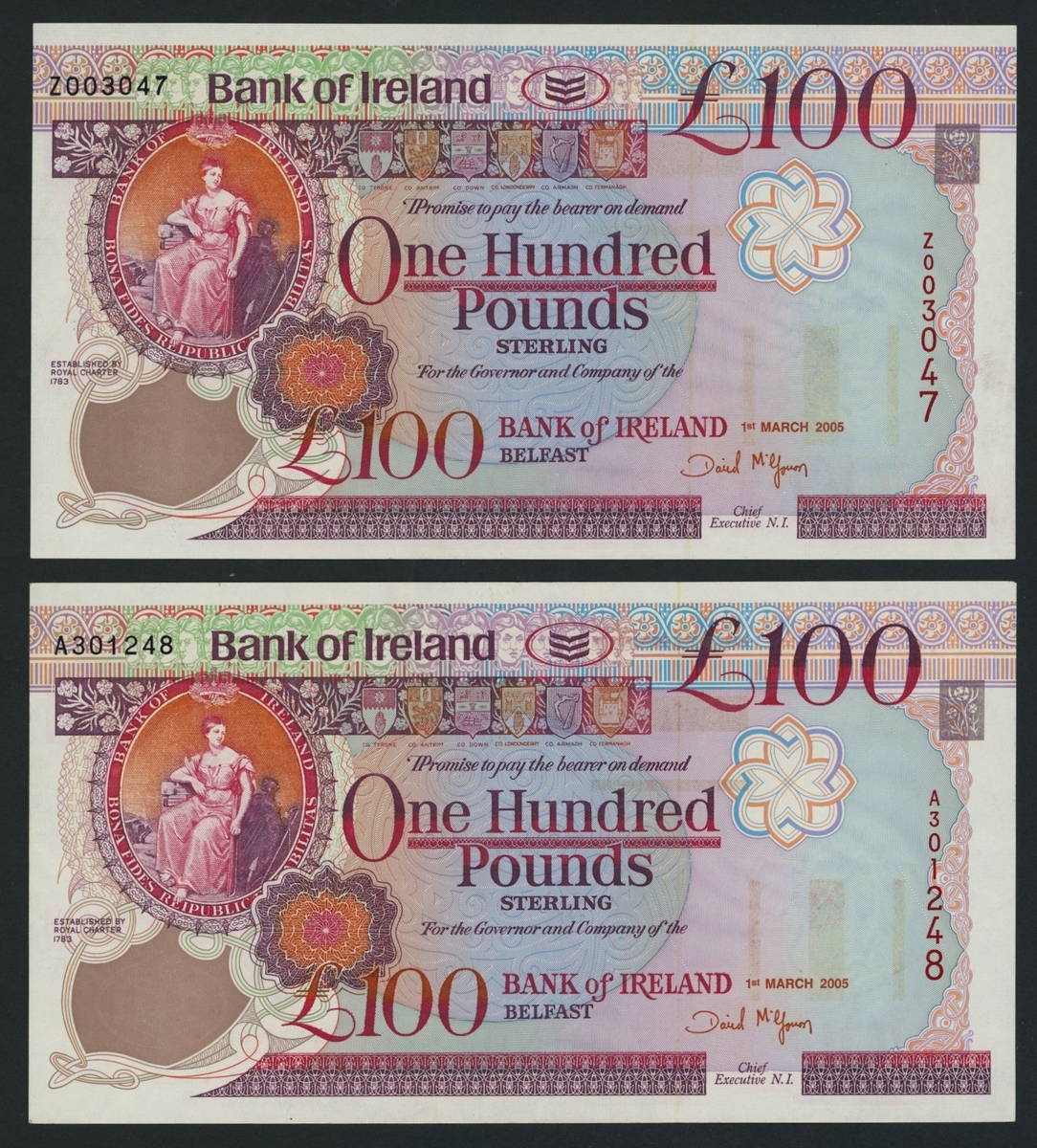 Bank of Ireland, [2 notes], £100, 1st March 2005, serial number A301248 and replacement note serial number Z003047, (PMI BA 141, 141r), about uncirculated, extremely fine (2 notes)