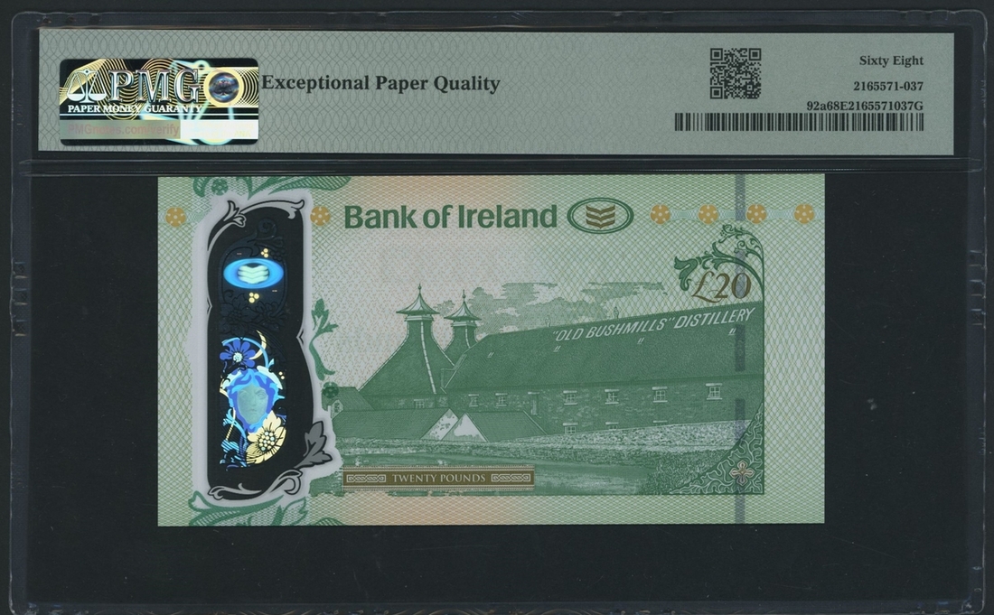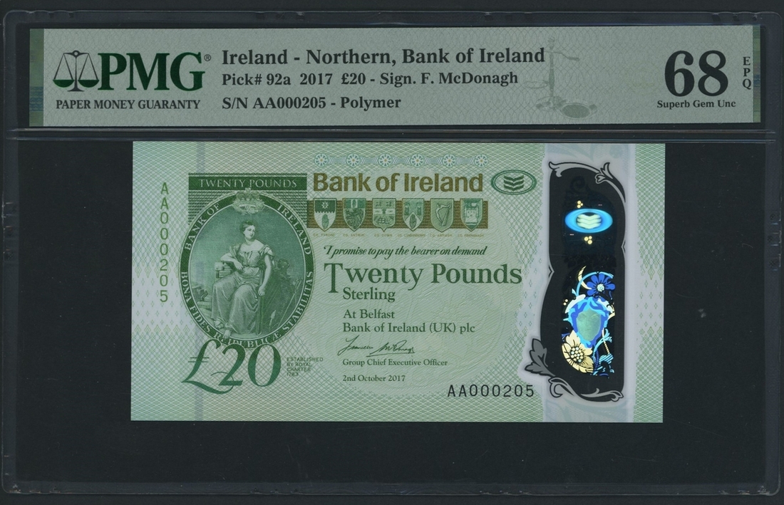 Bank of Ireland, Northern Ireland, £20, Belfast, 2nd October 2017, low serial number AA000205, (Pick 92a, PMI BA 151), in PMG holder 68 EPQ Superb Gem Uncirculated, only 9 notes awarded higher grades by PMG