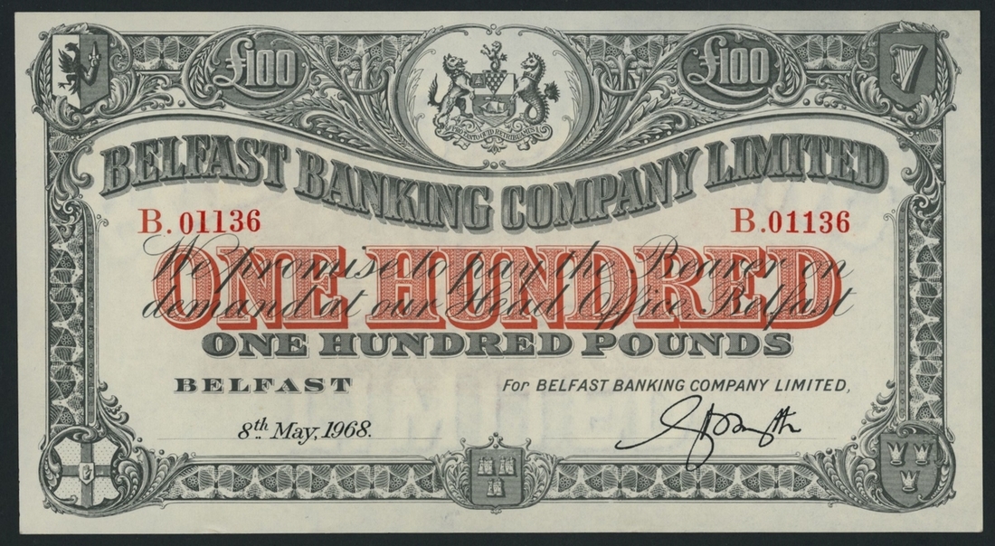 Belfast Banking Company, Northern Ireland, £100, Belfast, 8th May 1968, serial number B.01136, (PMI BB92, Pick 132), about uncirculated