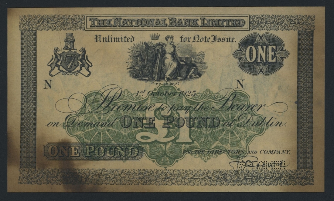 National Bank Limited, Ireland, specimen £1, Dublin, 1st October 1925, serial number prefix N, (Pick 225bs, PMI NA 66 for type), discoloured, otherwise paper at least good extremely fine
