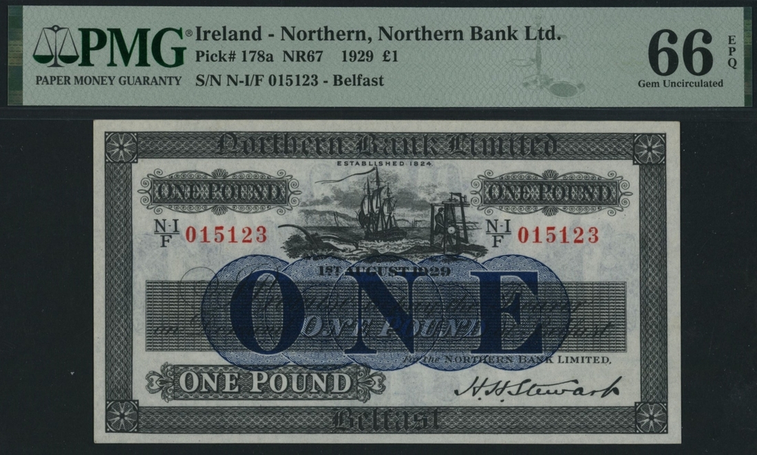 (x) Northern Bank Limited, Northern Ireland, £1, Belfast, 1st August 1929, serial number NI/F 015123, (PMI NR 67), in PMG holder 66 EPQ Gem Uncirculated, only 1 note in a higher grade on PMG Census