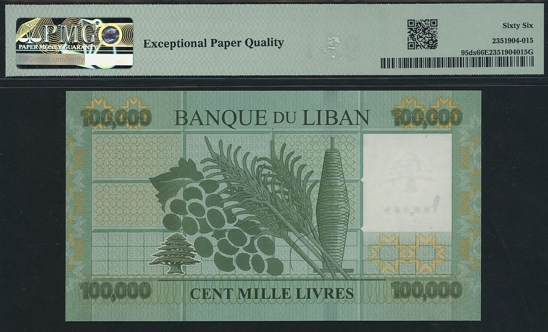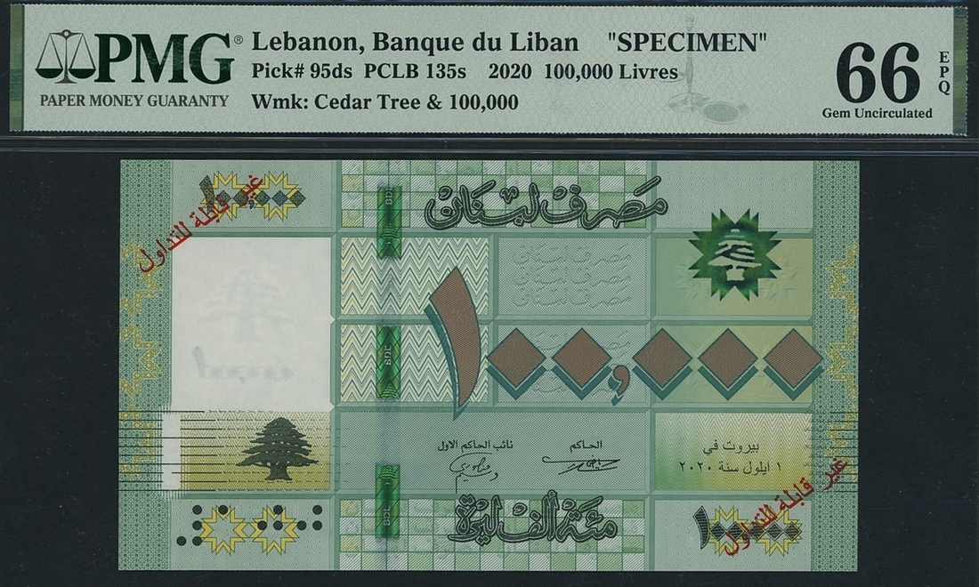 (x) Bank of Lebanon, specimen 100,000 Livres, 2020, no serial number, (Pick 95ds, BNB 537as) in PMG holder 66 EPQ Gem Uncirculated