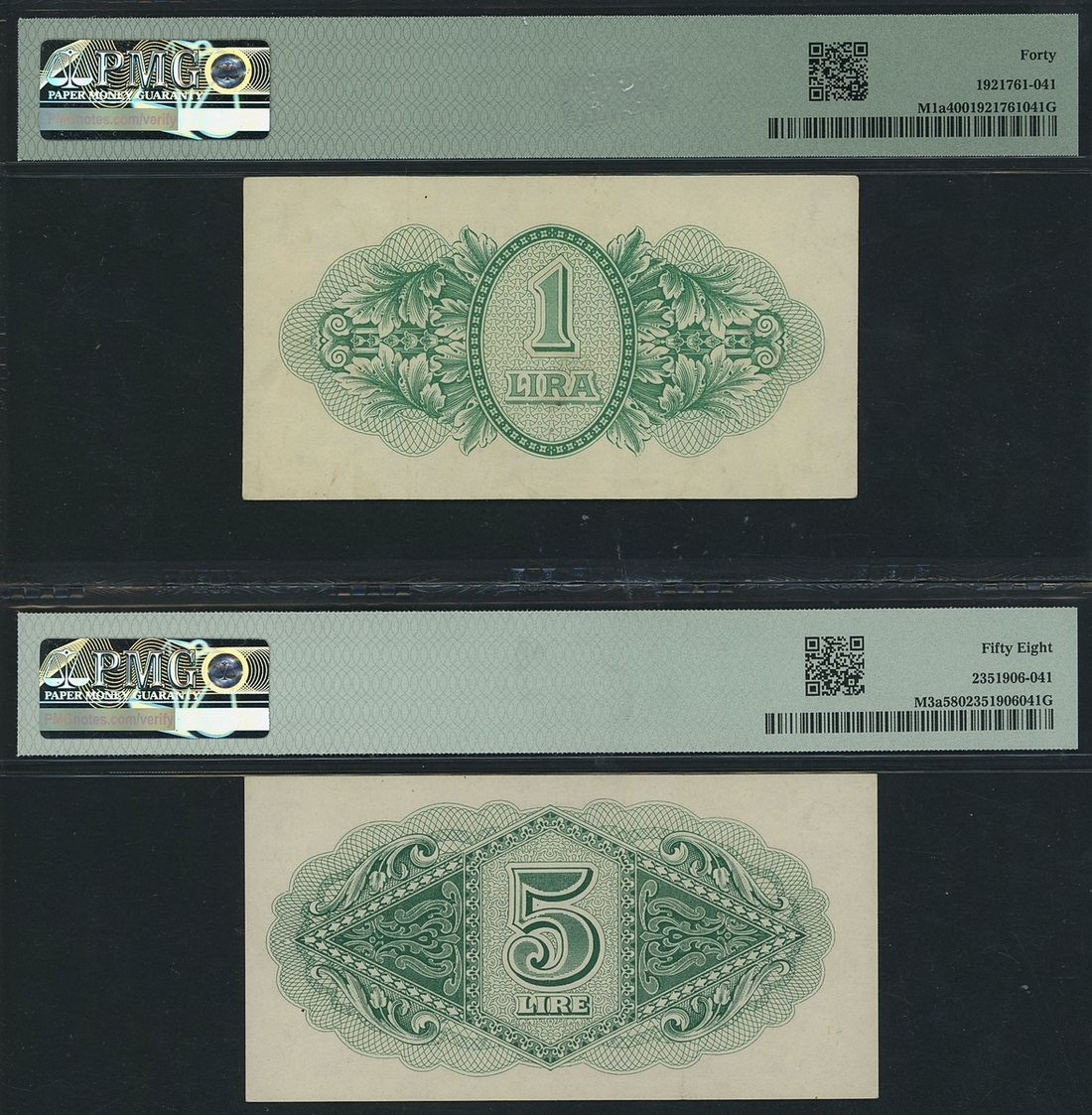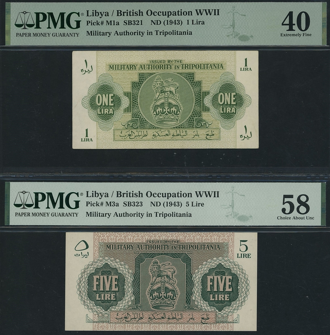 (x) Libya, Military Occupation WWII, [2 notes] 1 & 5 Lire, ND (1943), no serial numbers, (Pick M1a, M3a), in PMG holders 40 Extremely Fine, 58 Choice About Uncirculated [2 notes]