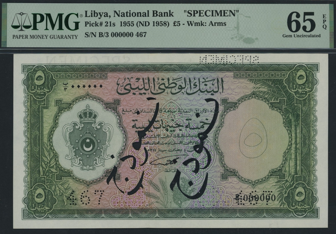 National Bank of Libya, specimen £5, 1955 (ND 1958), serial number B/3 000000 467, specimen number, English and Arabic perforations,