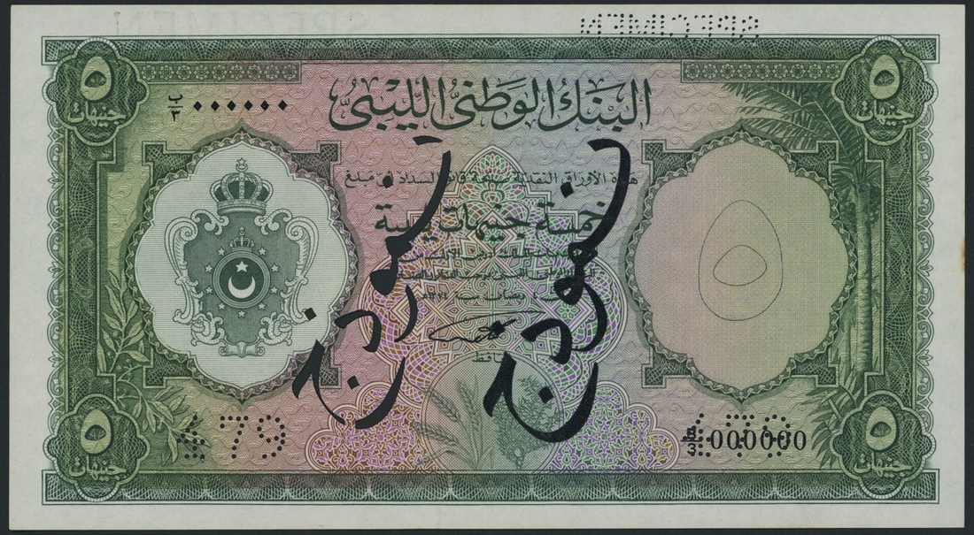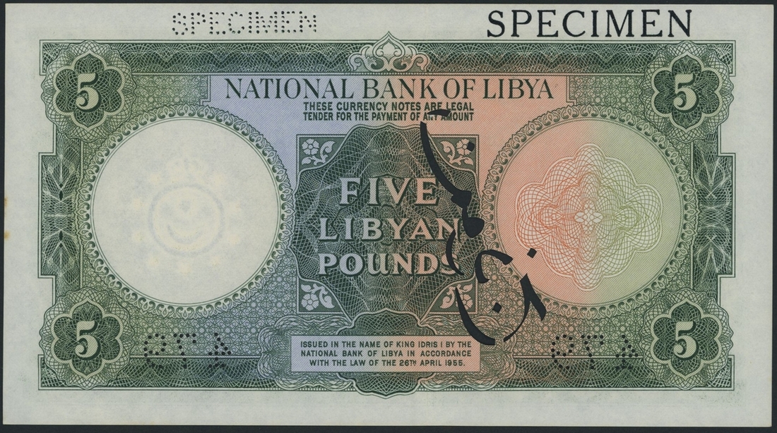National Bank of Libya, specimen £5, 1955 (ND 1958), serial number B/3 000000 480, specimen number, English and Arabic perforations,