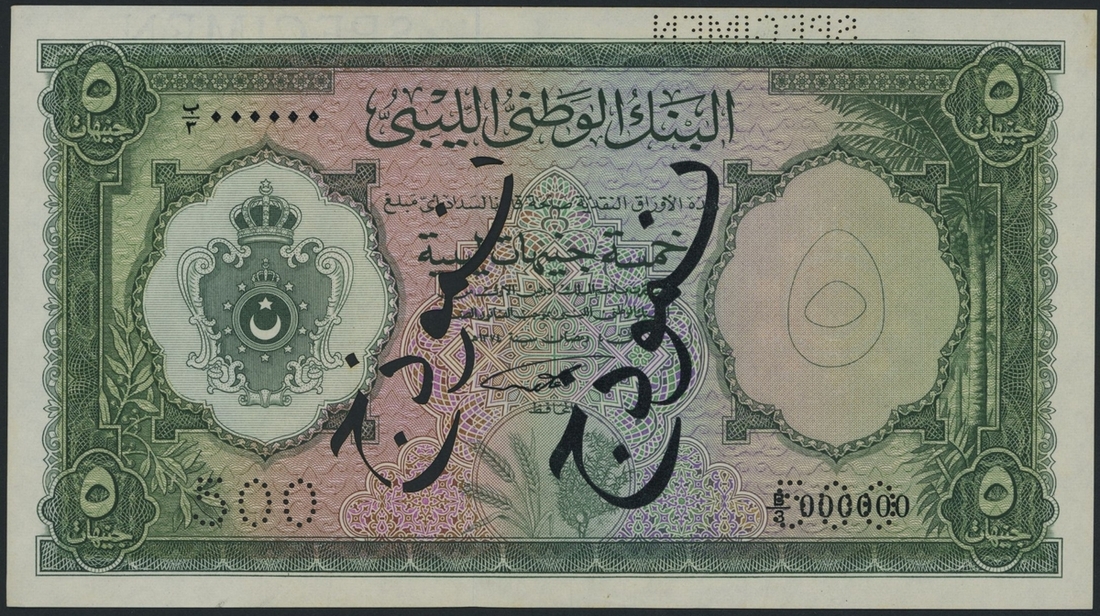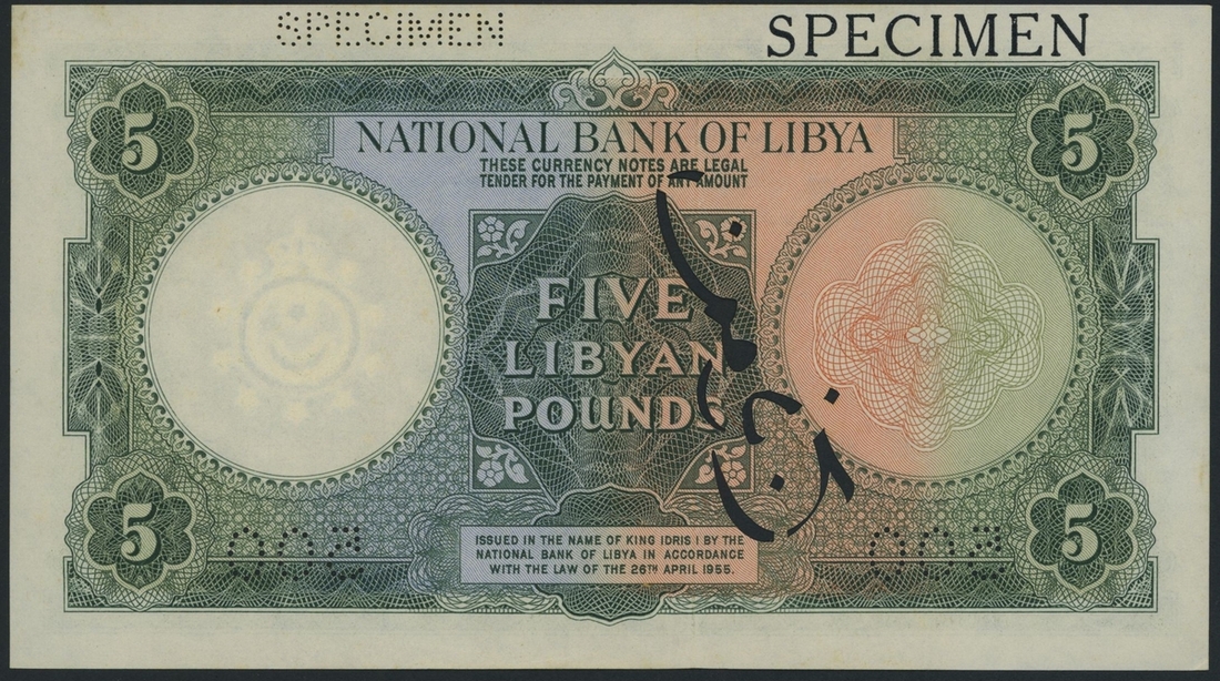 National Bank of Libya, specimen £5, 1955 (ND 1958), serial number B/3 000000 500, specimen number, English and Arabic perforations,
