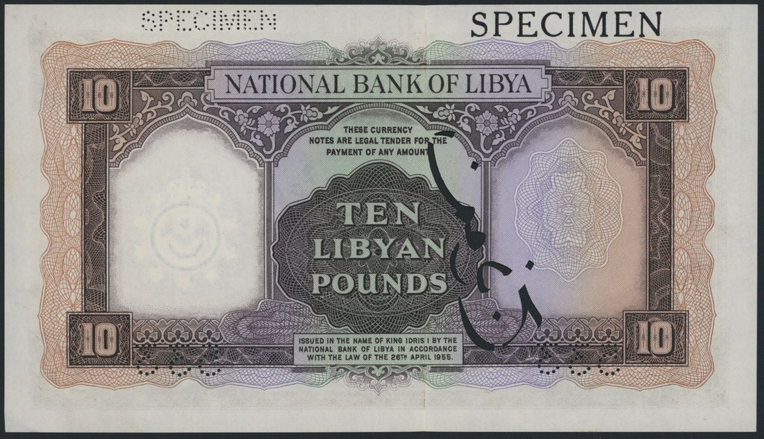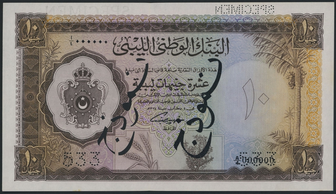 National Bank of Libya, specimen £10, 1955 (ND 1958), serial number A/4 000000 533, specimen number, English and Arabic perforations,