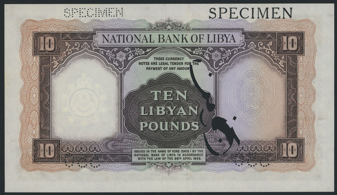 National Bank of Libya, specimen £10, 1955 (ND 1958), serial number A/4 000000 550, specimen number, English and Arabic perforations,
