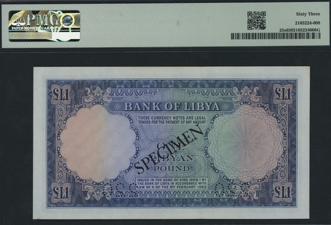 National Bank of Libya, specimen £1, 1963, serial number 4 C/11 000000 220, specimen number perforations,